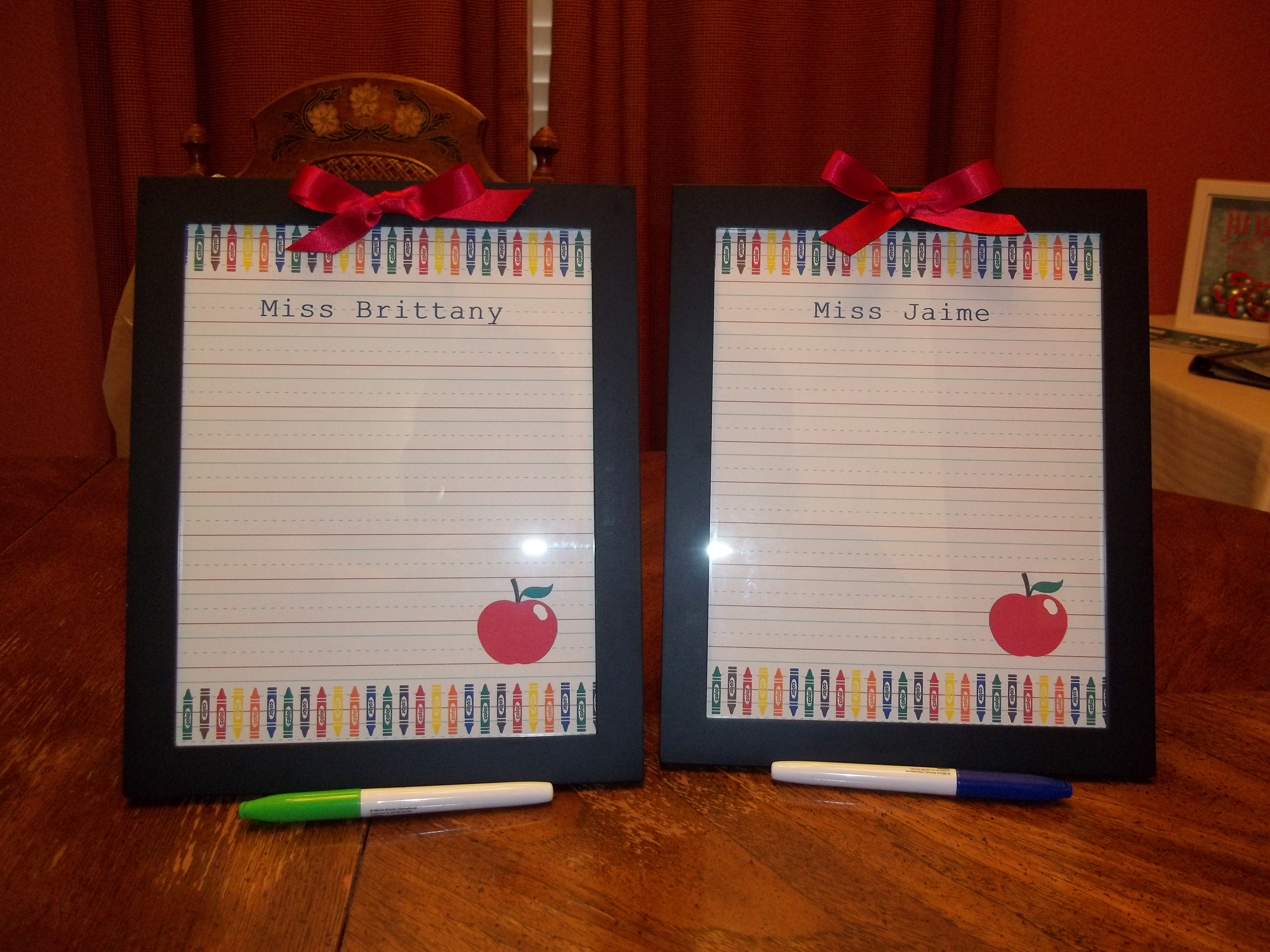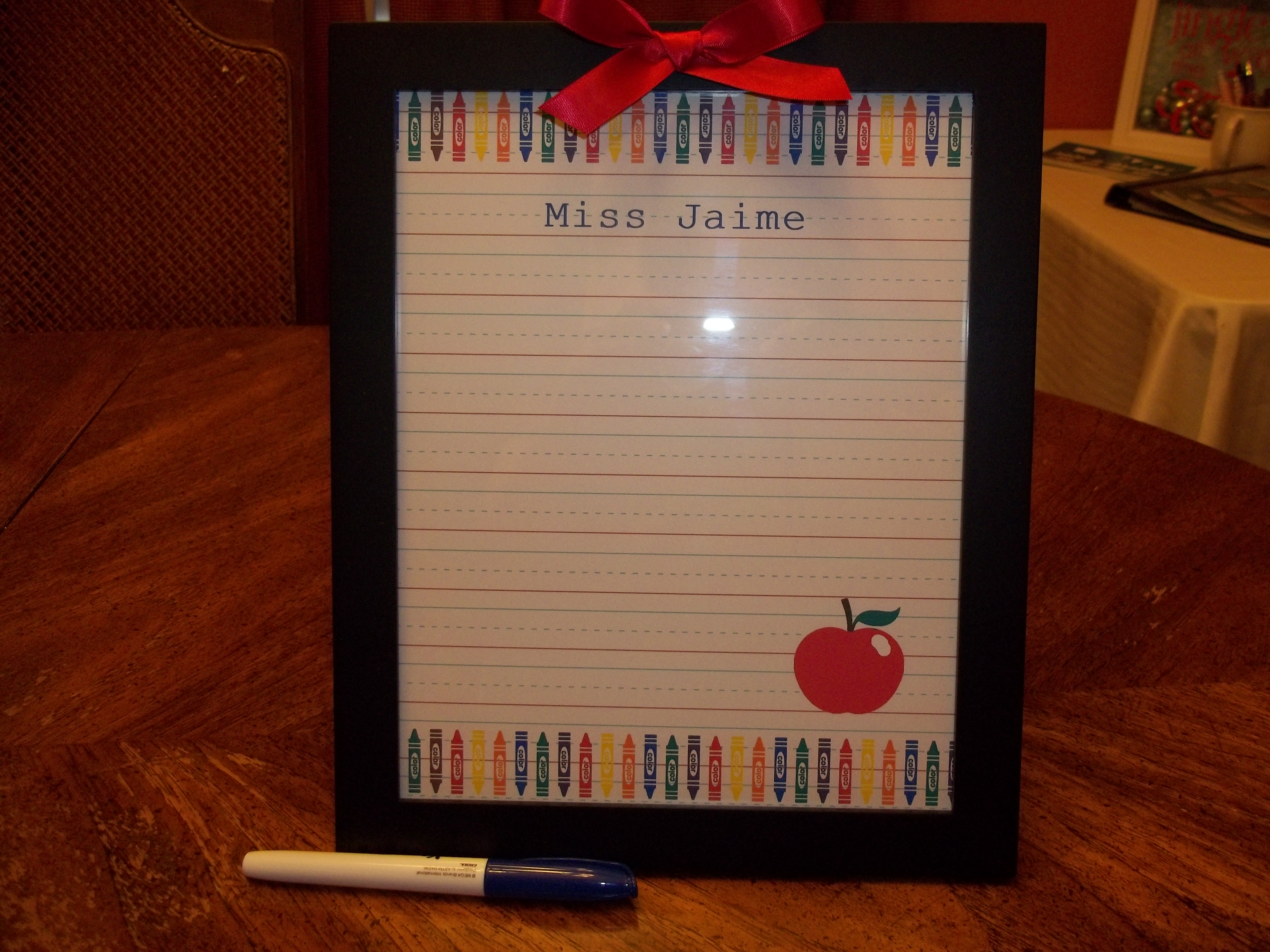 Here is a cute gift idea that I got from our favorite Pinterest!! I bought some inexpensive 8×10 frames from the store. Cleaned the glass surface off. Then I created an 8 1/2 x 11″ page in My Digital Studio! Gavin’s teachers have been so good to him the last year and a half. I wanted to make them something special! These dry erase boards are perfect! Too cute!!