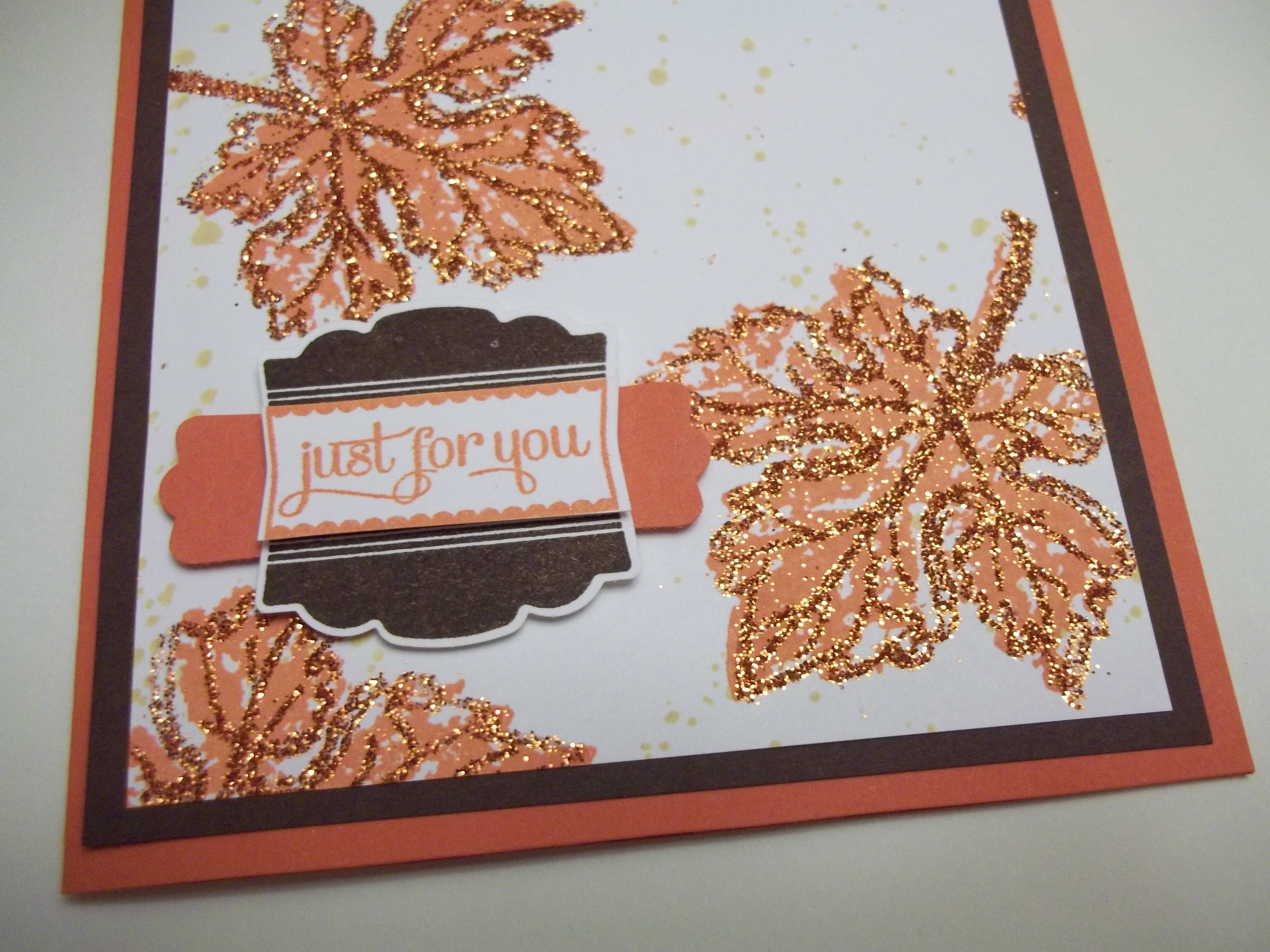 I love how this card turned out! I saw a similar card on Debbie Henderson’s Blog. She had the colors reversed and she used bleach to color in the leaves. I have been using my Heat & Stick powder a bunch since the Orange & Black glitter set came out! We made this card during club yesterday.