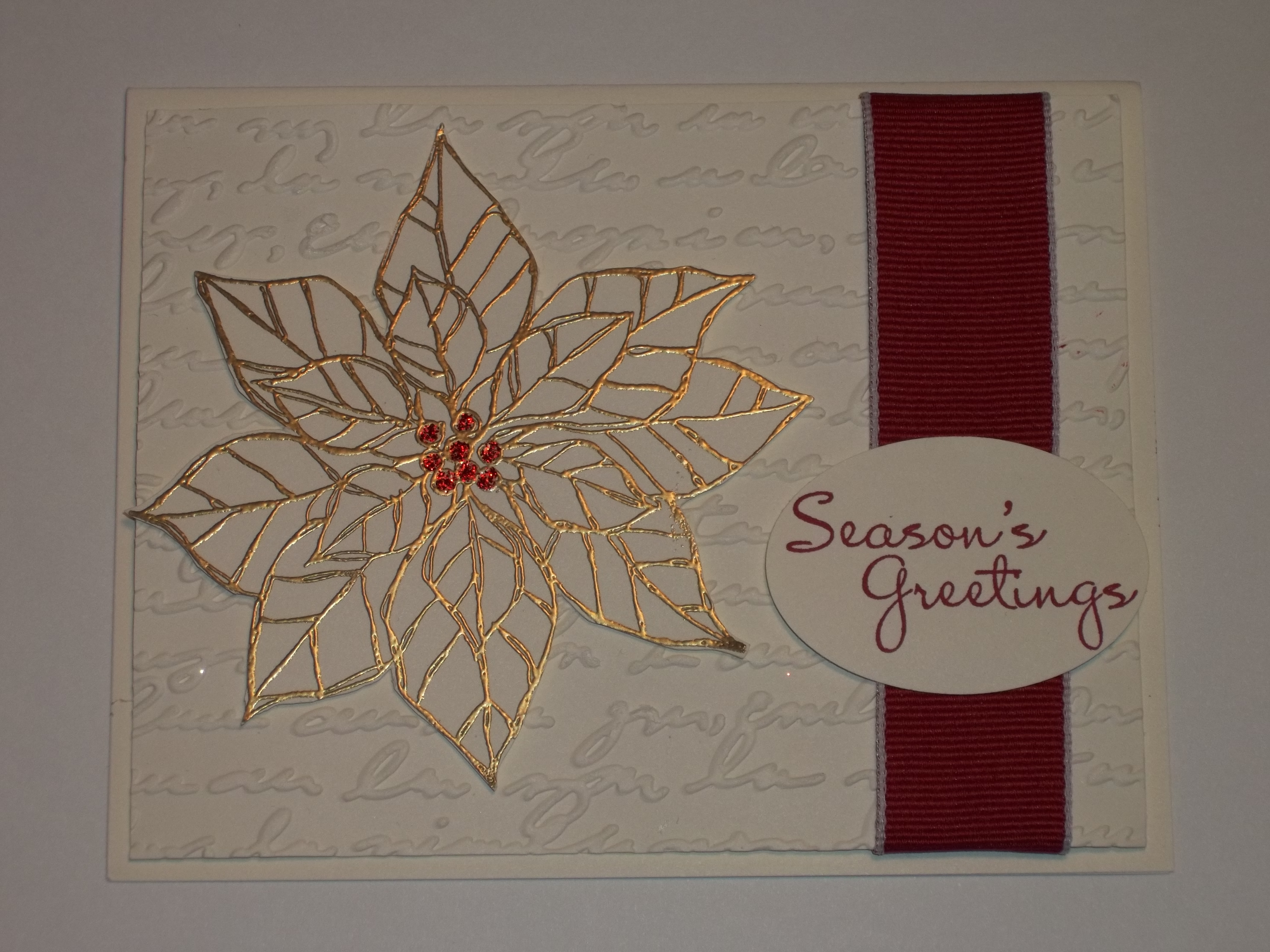 Accessories: Gold Embossing powder, Pretty Print Textured Embossing Folder, Cherry Cobbler 1″ Stitched Edge Grosgrain Ribbon, Cherry Cobbler Dazzling Details
