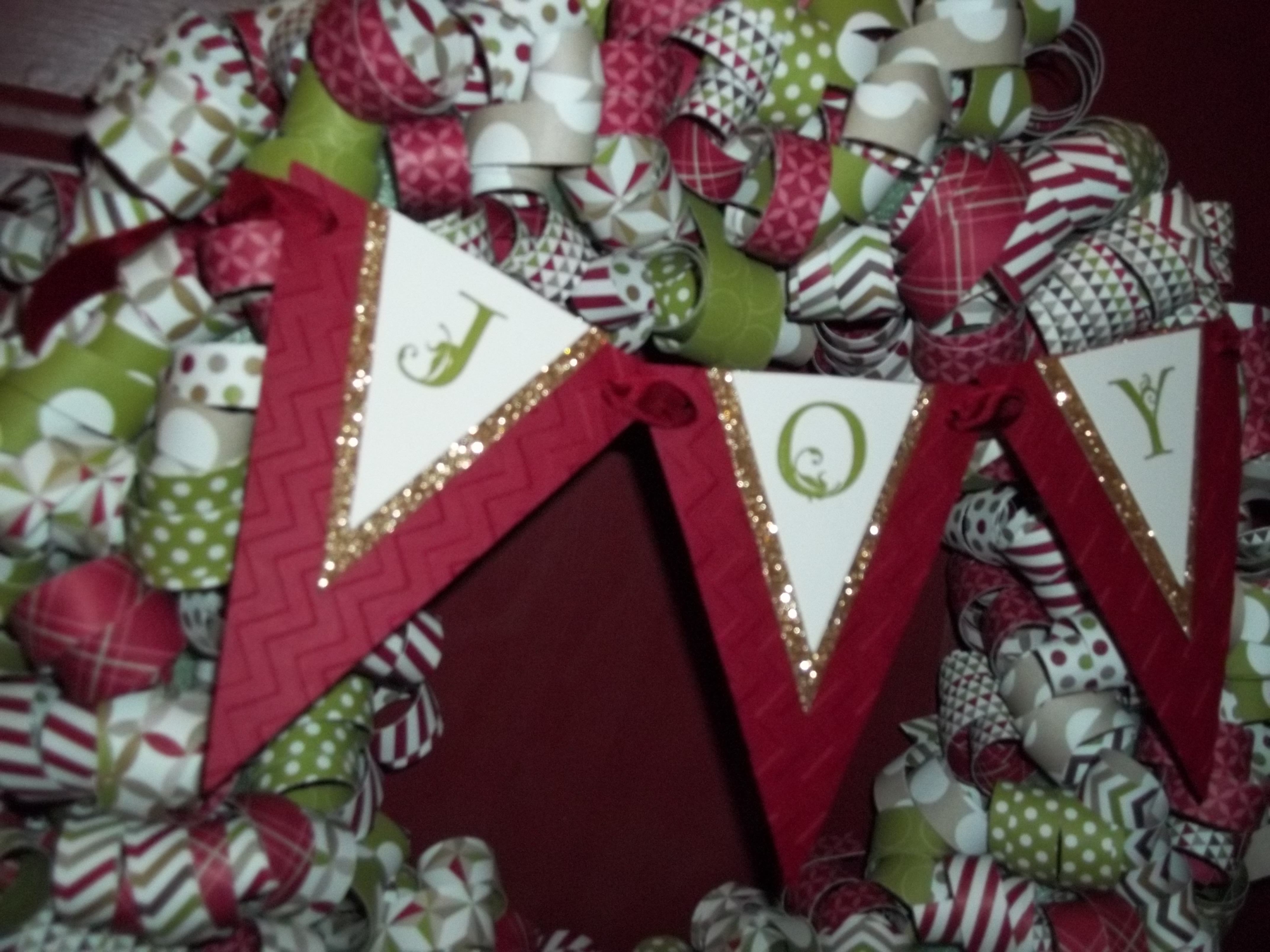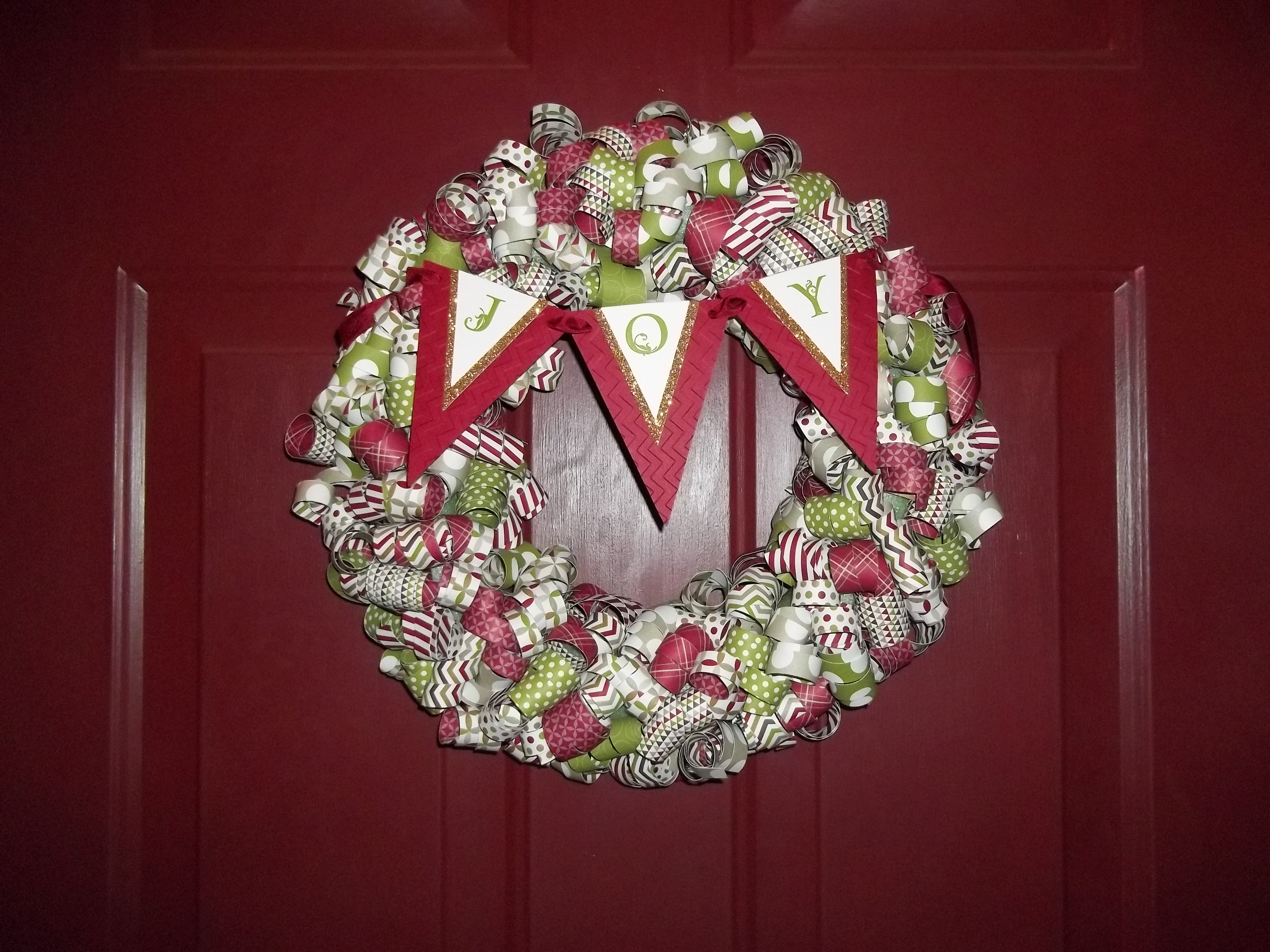 Woo hoo! It took three nights for me to complete this wreath. I enjoyed doing it! Great for watching your shows and getting the curling done too! I used 8 sheets of 12×12 Season of Style DSP. First I cut the paper into 1/2″ x 12″ strips. Then, I used my bone folder to curl each strip. I actually put them in a paper shopping bag so they would all be in one place and portable. Then I took pins and pinned each into place by placing the pin in the middle of each strip. Just be sure not to put the same design or color too close together.
