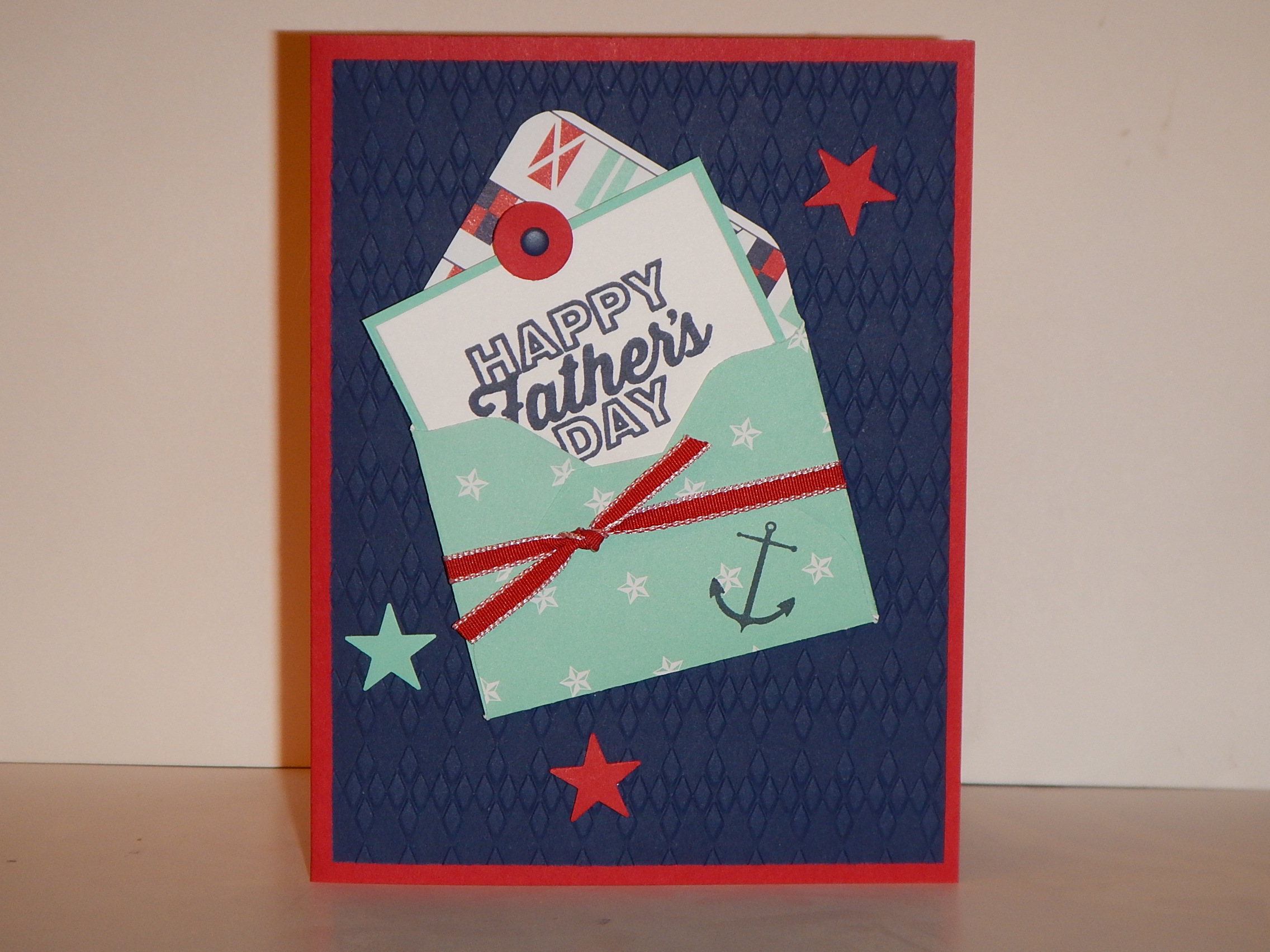 I procrastinated last week preparing for my club on Sunday. I had 2 of my 3 projects finished and could not get the creative juices flowing! After 3 other attempts with other stamp sets and colors, I turned to a super cute layout my upline did last month! I was also thrilled to get the My Paper Pumpkin on Thursday! It has a great Father’s Day stamp in it!!