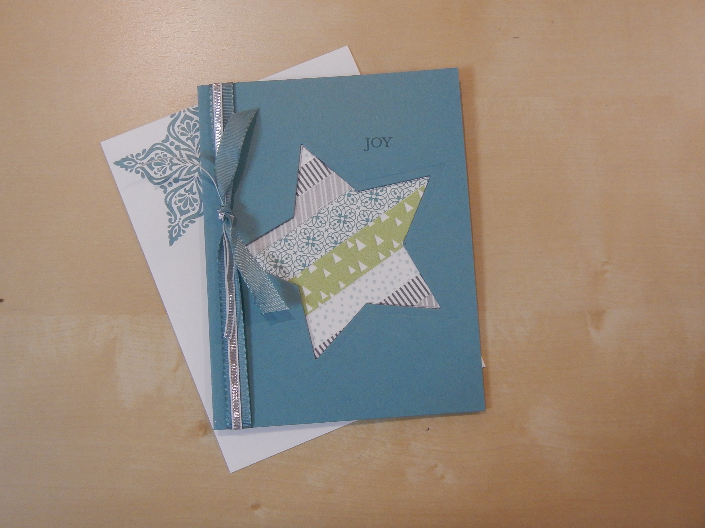 Here are two cute ideas to use washi tape! I had cut a star out for a different card and thought what I cute negative! I traced the star onto a piece of Whisper White card stock and then applied All is Calm washi tape. Taped that behind the star negative and whala!!