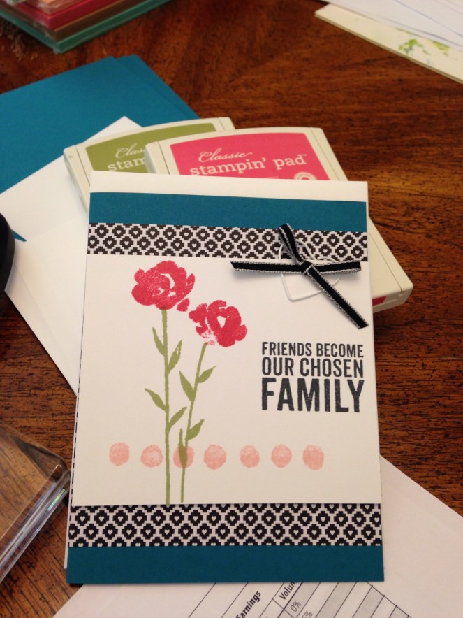 I had my first opportunity night the other day. I feel it turned out well! We made a simple-but pretty card using Painted Petals stamp set. The inks were Strawberry Slush, Pear Pizazz, Blushing Bride, and Momento Black. The card base is Bermuda Bay with a black/white sheet from the DSP paper stack.