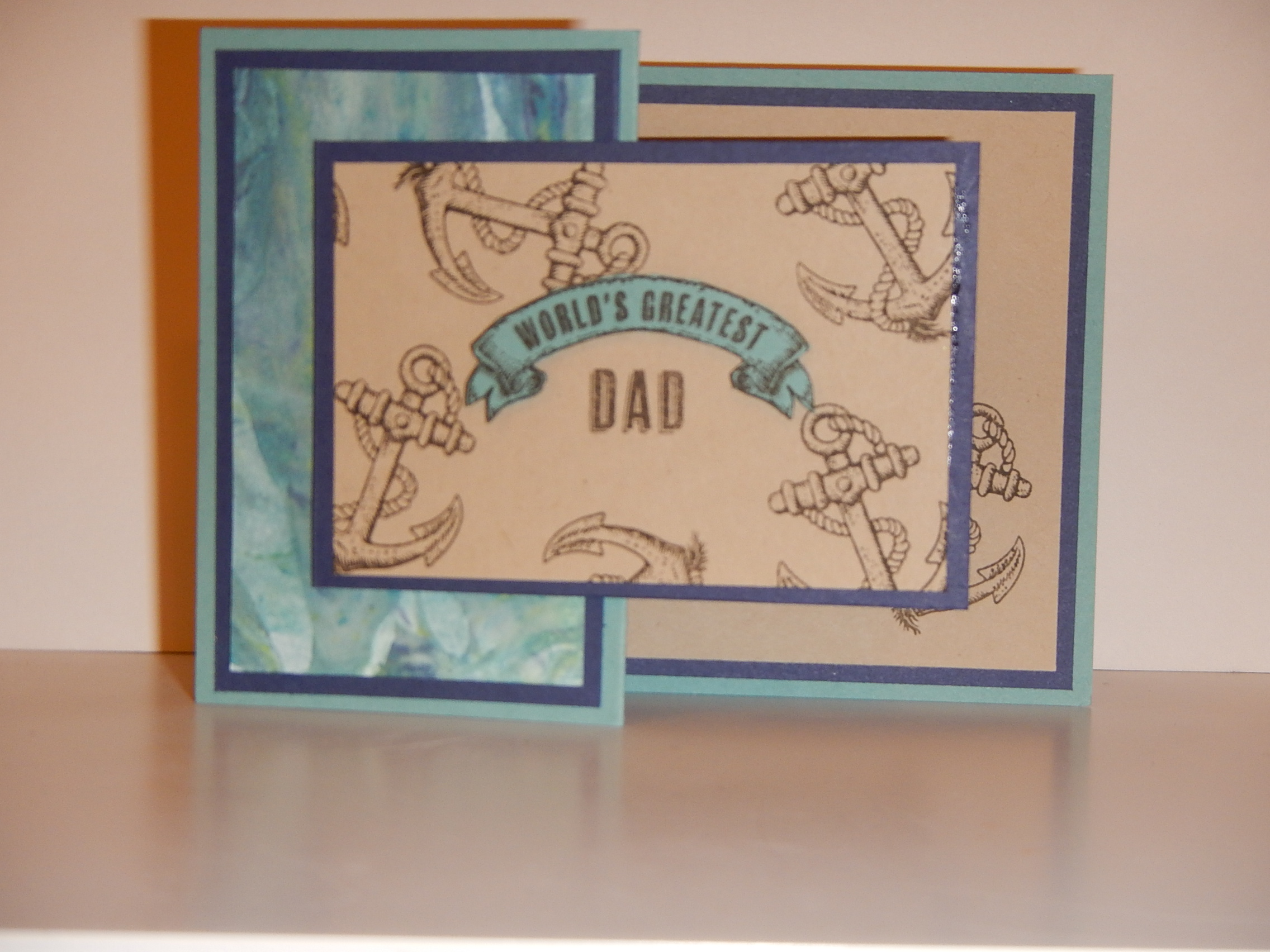 I finally can share this cute card I made for my Dad! I love the versatility of using Guy Greetings! I also incorporated the shaving cream technique. I used Lost Lagoon, Night of Navy, and a touch of So Saffron.
