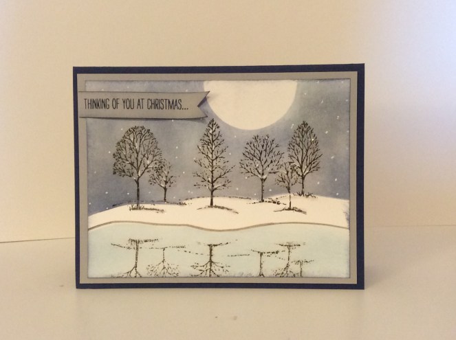My girls at stamp,club love new techniques. This is so simple and beautiful at the same time! I really wanted to capture the peacefulness of snow before dawn. We don’t get snow in Texas much (more ice than snow)