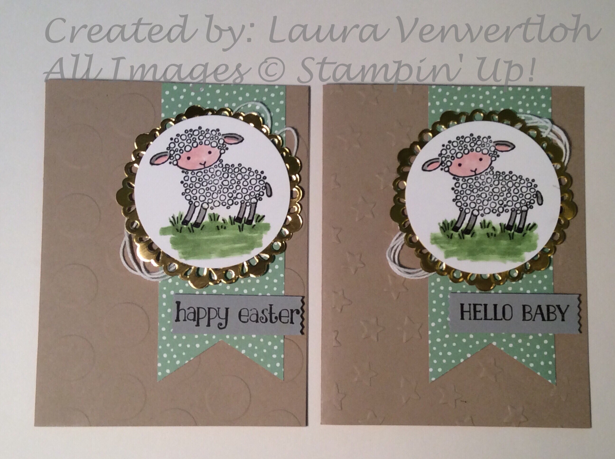 I knew the second I saw Easter Lamb in the Occasions catalog, that it could double as a baby set! It’s just so stinkin’ cute!! I made the Easter one for club, and thought I would give them a choice! I used Birthday Boquet DSP for the gender neutral color, and changed the embossing folder. He was colored with blender pens and ink pads. I liked accenting him with Smoky Slate on his ears, tail, and legs.