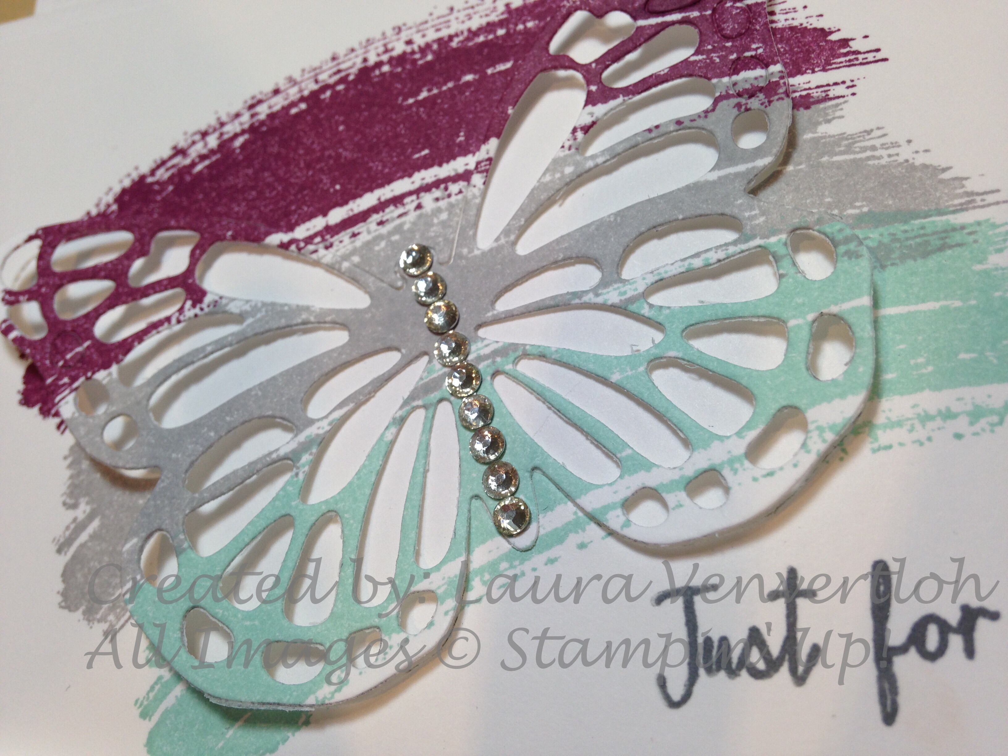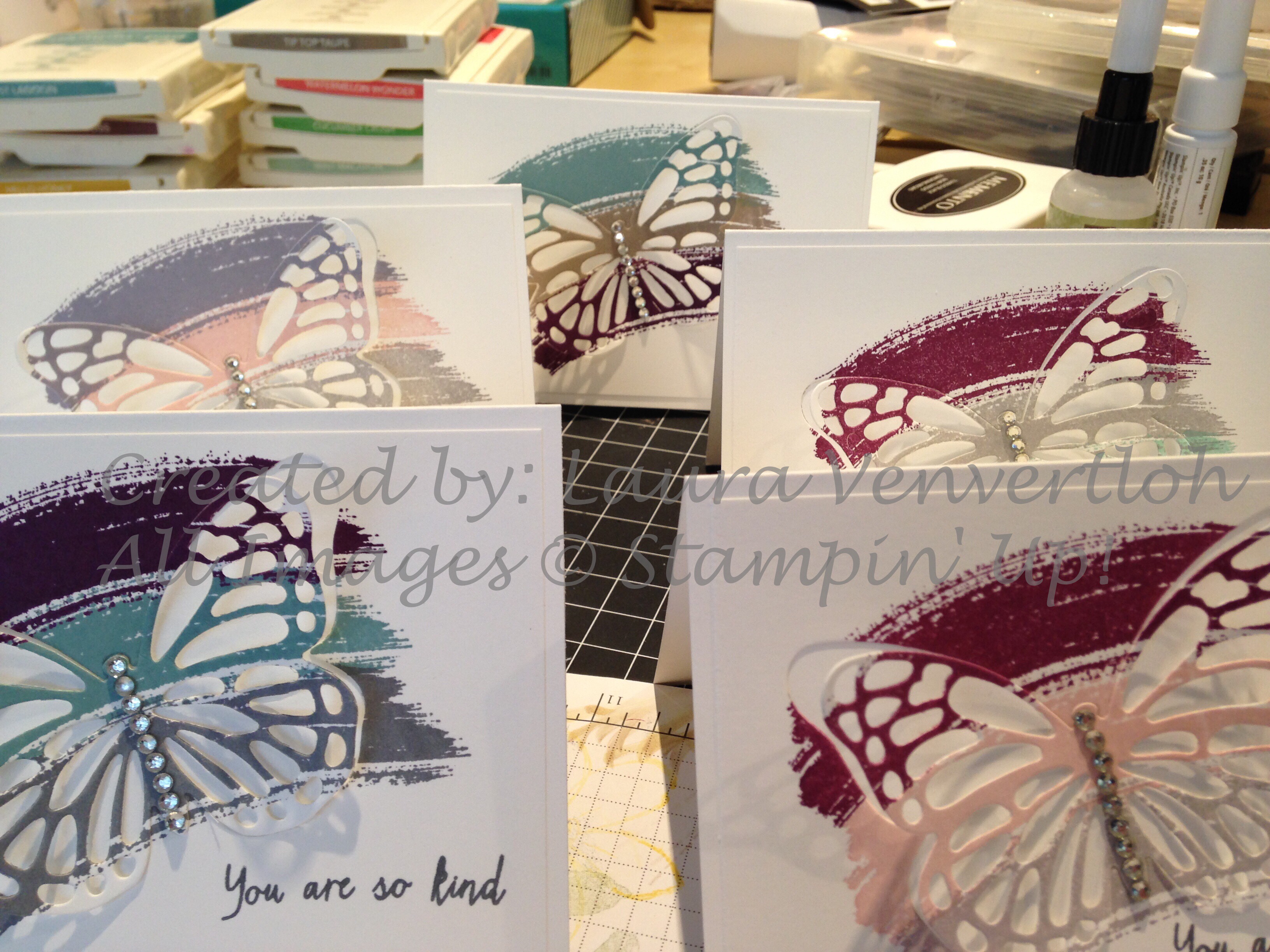 I just popped the butterfly back where it was prior to cutting it out. The white background is the Whisper White note card. I added some Basic Rhinestones and sentiments. These were all made in under 30 minutes!