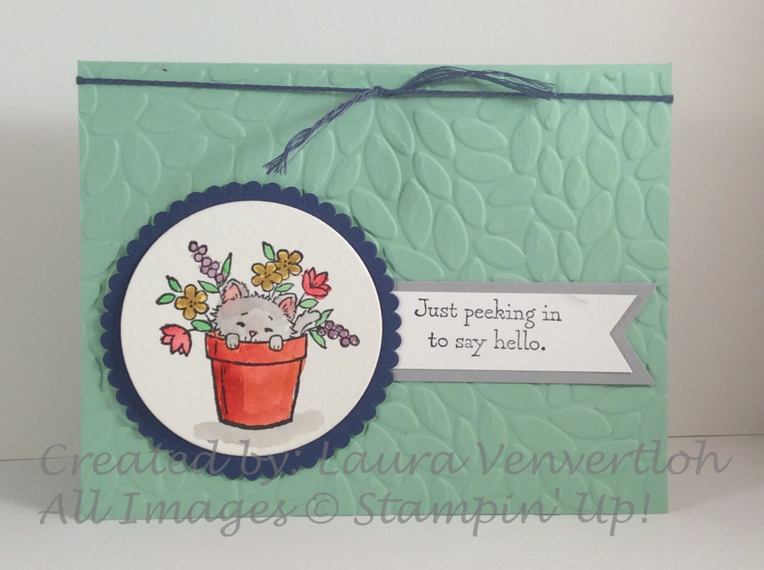 This isOne of my favorite cat sets that Stampin Up! Has come out with in a while! Love to watercolor with it too! With the Aqua Painter and ink pads, I used Cajun Craze for the pot. I stuck with the color combo that is in the Love and Affection DSP. I also put Gols Wink of Stella on a couple flowers. This was the first time I used the Petal Burst embossing folder too! Love it!