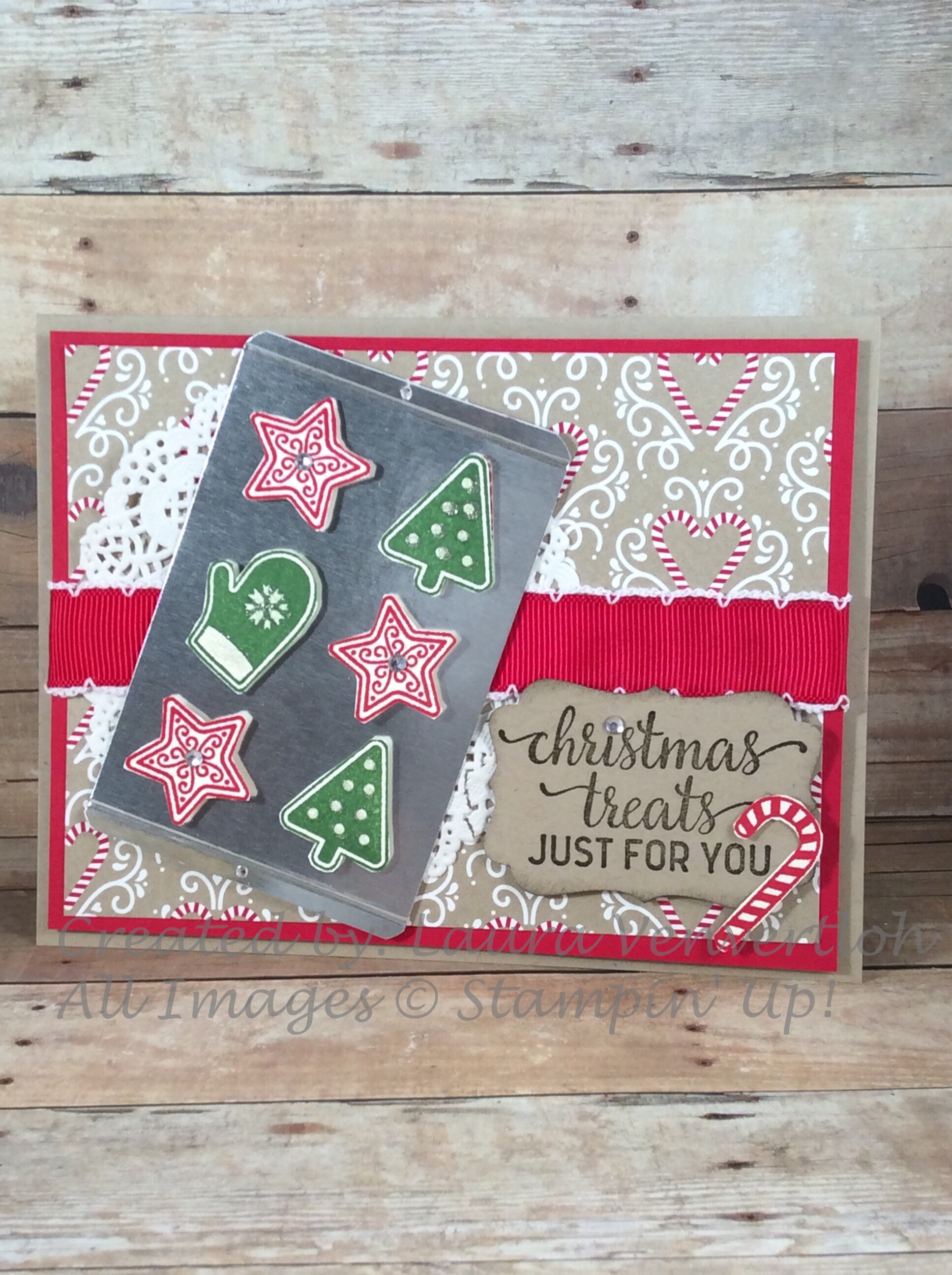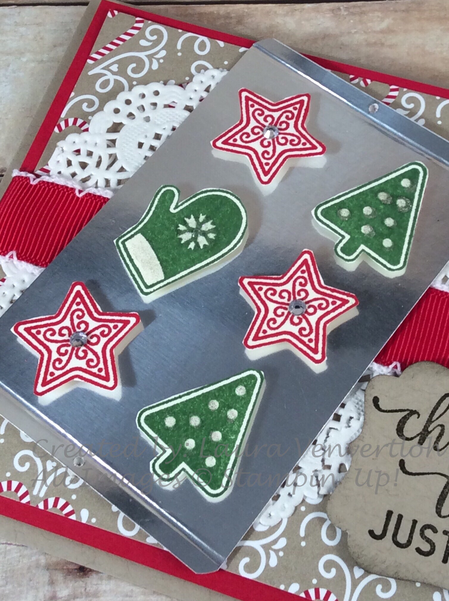 Candy Cane Christmas is the cutest stamp set! I immediately thought of cookies on a cookie tray. I used the Silver Foil (3 1/2″x 2 1/2″) then scored it with the simply scored tool at 1/8″ on each side. Then used the Project Life Corner Rounder-just not all the way to the end. A quick hole punch on each side and whala!