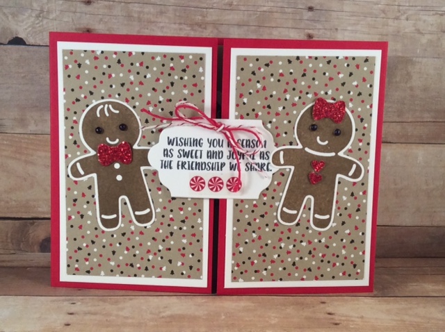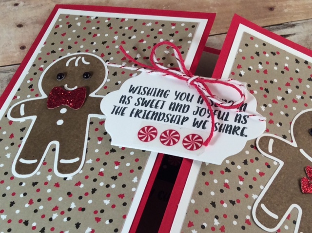 Of course I had to use the Candy Cane Lane Baker’s Twine! I used both and tied them together! It was hard to choose, so why not use both? Then I added a little touch of the Candy Cane Lane washi tape. Dimensionals are on one side of the sentiment and I made sure the opposite side could tuck under the gingerbread girl’s arm. I colored pearls with a black sharpie for added depth and of course red glimmer paper! But look what’s inside!