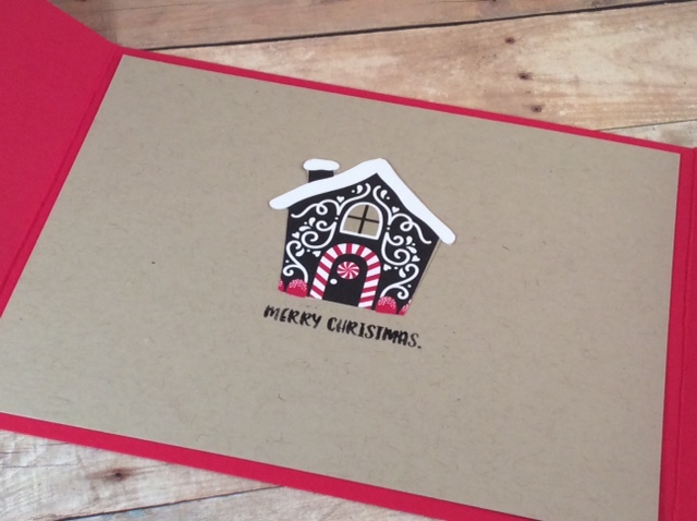 I had so much fun making this card! I started by scoring a 4 1/4″ x 11″ piece of Real Red cardstock and scored at 2 3/4″ from each end. I wanted it to look like a peek inside a gingerbread house!