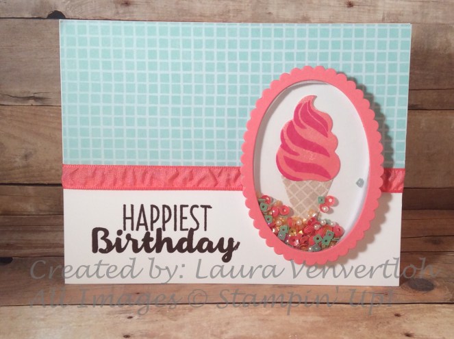 My girls at stamp club have been asking to learn how to make shaker cards!  So, wish granted!  How cute did this turn out?  I used the Cool Treats Bundle and the Sprinkles Embellishments to add the FUN!
