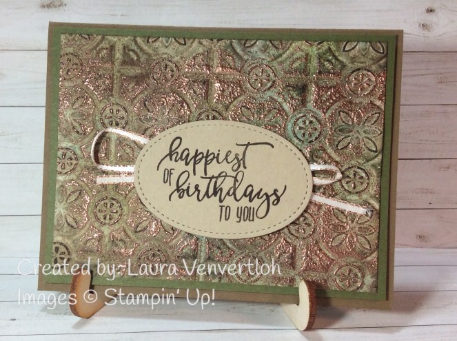It’s pretty simple and you get inky fingers too! You start with using the Crumb Cake ink pad and pouncing it on the side of the Tin Tile embossing folder that has the Stampin’ Up! information on it. Run a piece of Very Vanilla through with the EF using the Big Shot. Then you will take Daubers and rub in a circular motion around the card. Random areas work best. I used the following order for the ink pads: Balmy Blue, Mossy Meadow, Soft Suede, then Versa Mark. You want to use the pad of the Versa Mark and drag lightly. I then covered it with Copper Embossing Powder and used the Heat Tool.