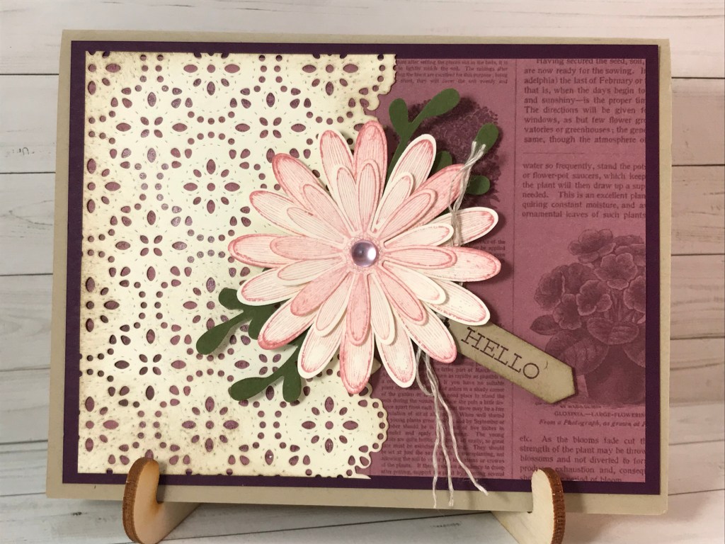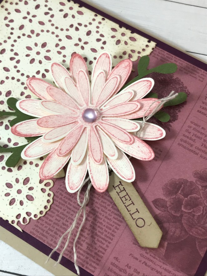 I used 4 punches, 2 stamp sets, a die, linen thread, epoxy gem, and cardstock. Now, I had a great tip from a fellow demonstrator on how to build your “sandwich” with your die cutting machine to help cut out all those little dots on the lace!