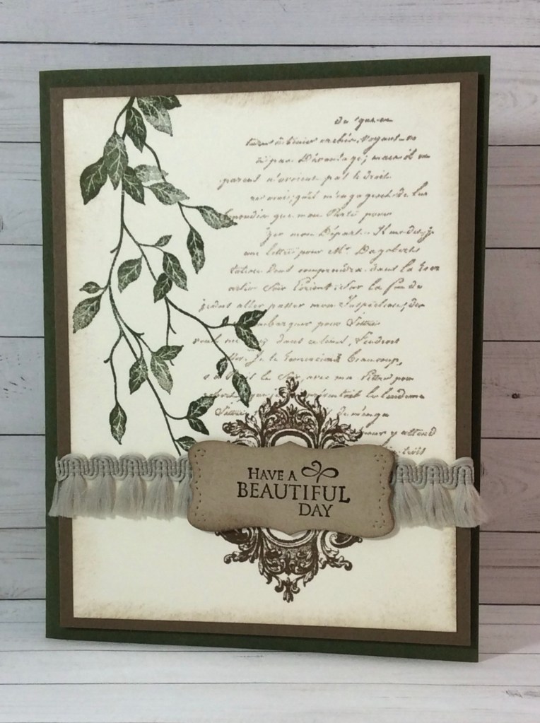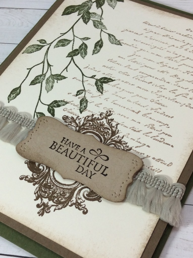 The Woven Threads Trim is Devine! I used my Paper Snips to cut the bottom strings and pulled them off to create this fun fringe effect! I used Crumb Cake to stamp the verse in the background and Mossy Meadow for the leaves. I then stamped the scroll with Soft Suede. I used Tear & Tape to adhere the Woven Threads to the card and positioned it almost center the scroll. I distressed the Very Vanilla base and the sentiment with Crumb Cake. I used a die from the Perfect Parcel dies.