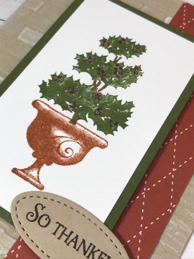 Then I used a strip of the 6×6 Regals DSP pack, Cajun Craze, to accent the side. The topiary is stamped with Mossy Meadow, Soft Suede, and Cajun Craze. Next, I accented the greenery with Merry Merlot berries and Wink of Stella. It’s all finished with the sentiment of your choice!