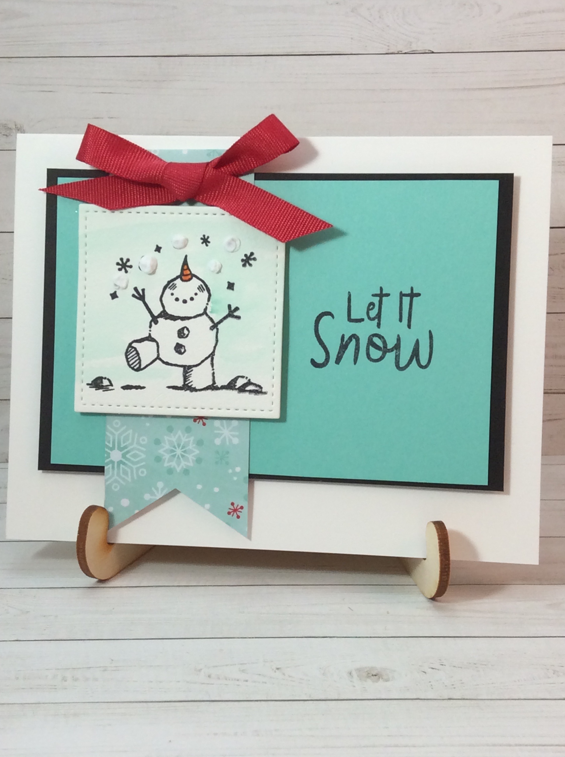 To make the color combination for this card, I just picked out the snowfall piece from the Let It Snow Specialty DSP. To give the snowman image more texture, I cut it out with the Stitched Shapes dies and added a Real Red Cotton Bow to anchor the image. The girls LOVED this card yesterday!