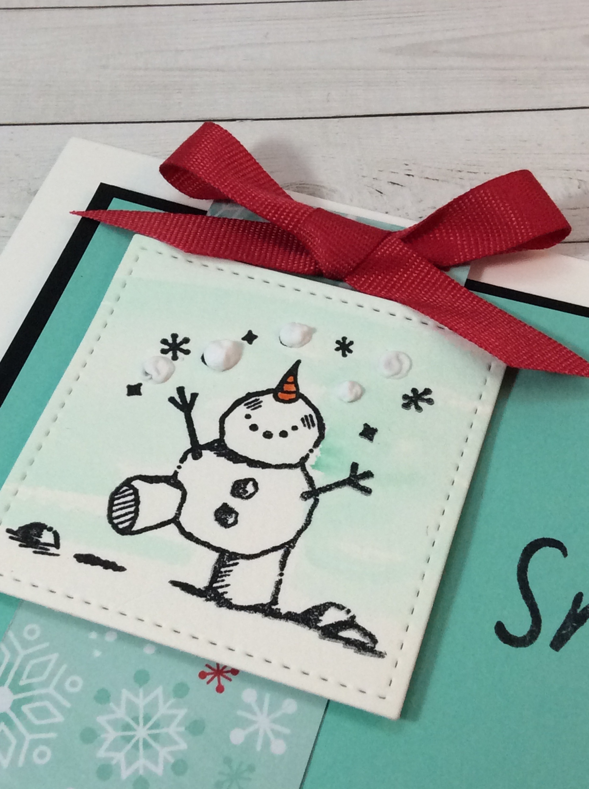 Here is a close up of the puff paint as snow balls! It’s just therapeutic to watch it pop up! The background has a quick watercolor wash of Costal Cabana to make the snowballs pop even more!