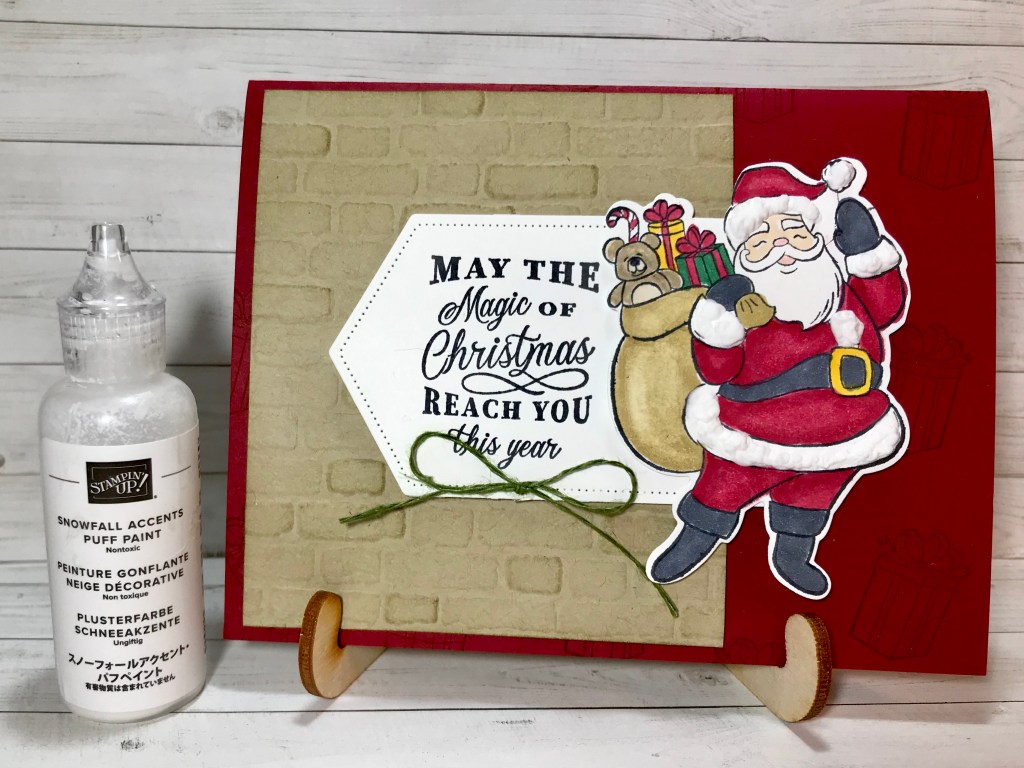 So, now I have a Snowfall Puff Paint obsession to go with my Wink of Stella one! (funny I didn’t use the Wink on this card!) But I have used it on wood ornaments, cards, tags, and now Santa!! I love how he turned out! I colored him in with Stampin’ Blends and then was able to cut him out in a snap! There is a die for that!! No fussy cutting!! To make it fun, I ran some Crumb Cake cardstock through the Die Cutting Machine with the Brick Wall 3-D folder. I then used a sponge loaded up with Crumb Cake to give it a distressed look.