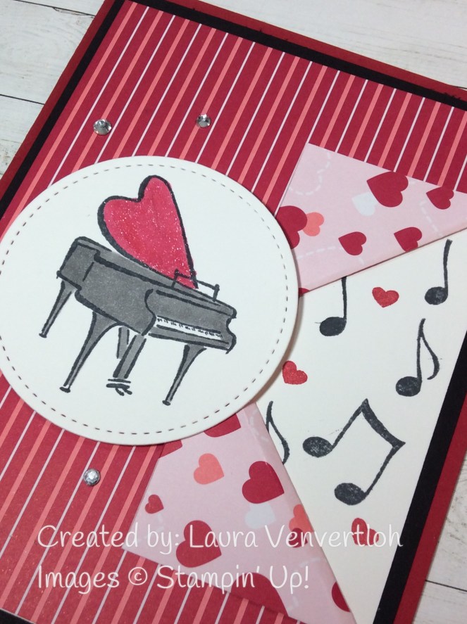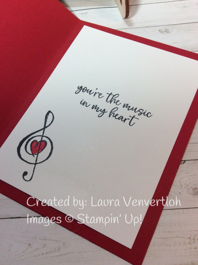 I finally was able to play with my pre-order goodies from the Mini Catalog and Sale-a-bration catalog! The Music from the Heart stamp set was top on my wish list! I grew up playing the piano (not well, but I could do it) and I love all types of music! I have fond memories with songs and pieces from over the years! With Valentine’s Day fast approaching (yes, I know-crazy!), I wanted to create a card with a musical vibe!
