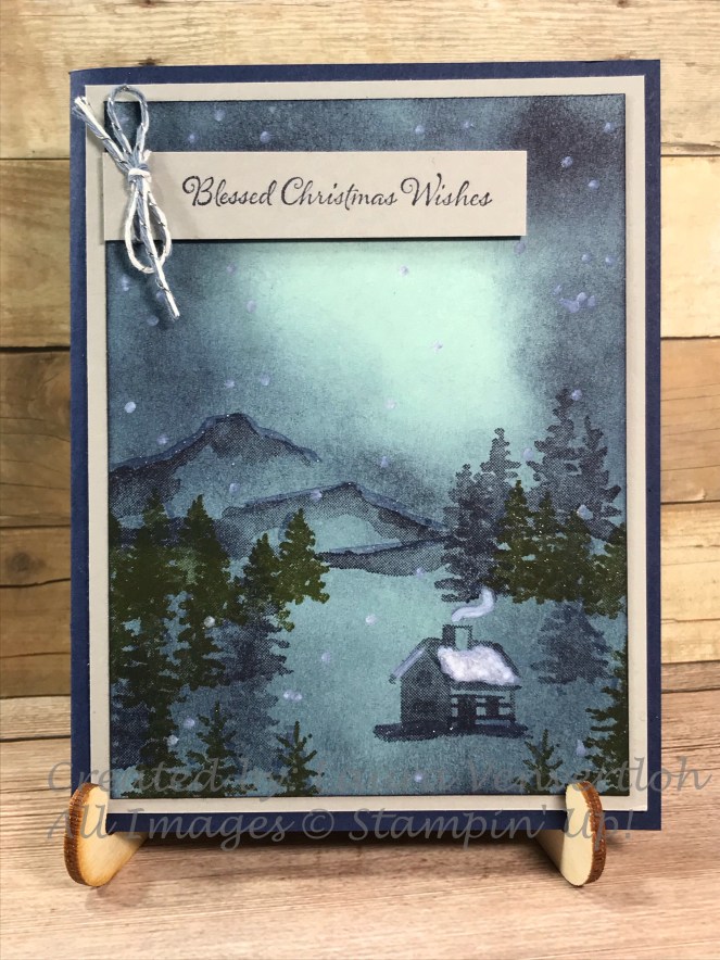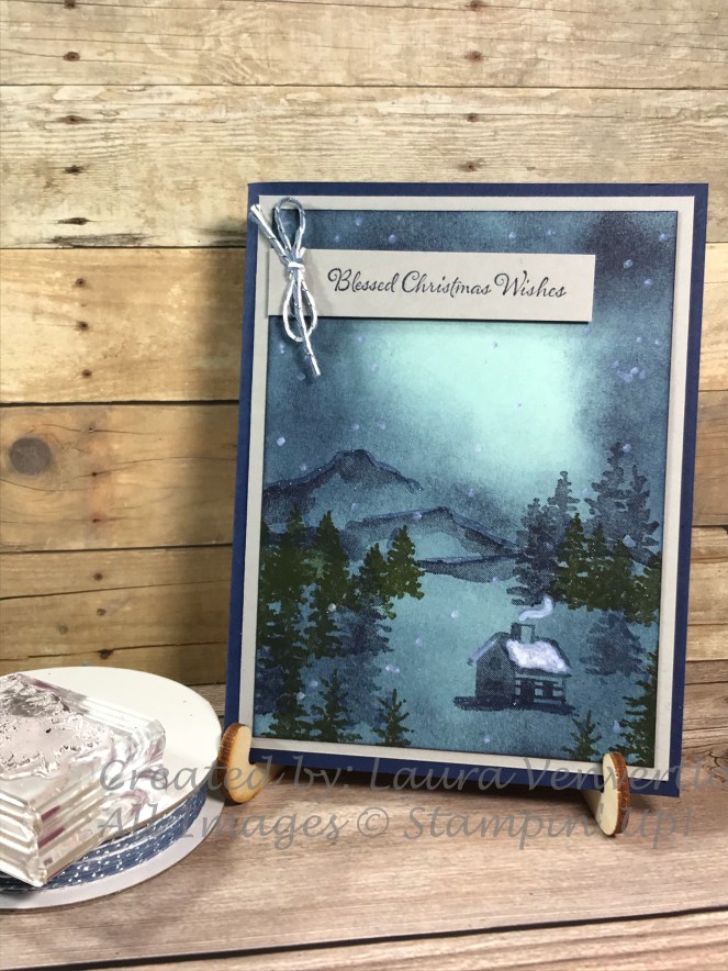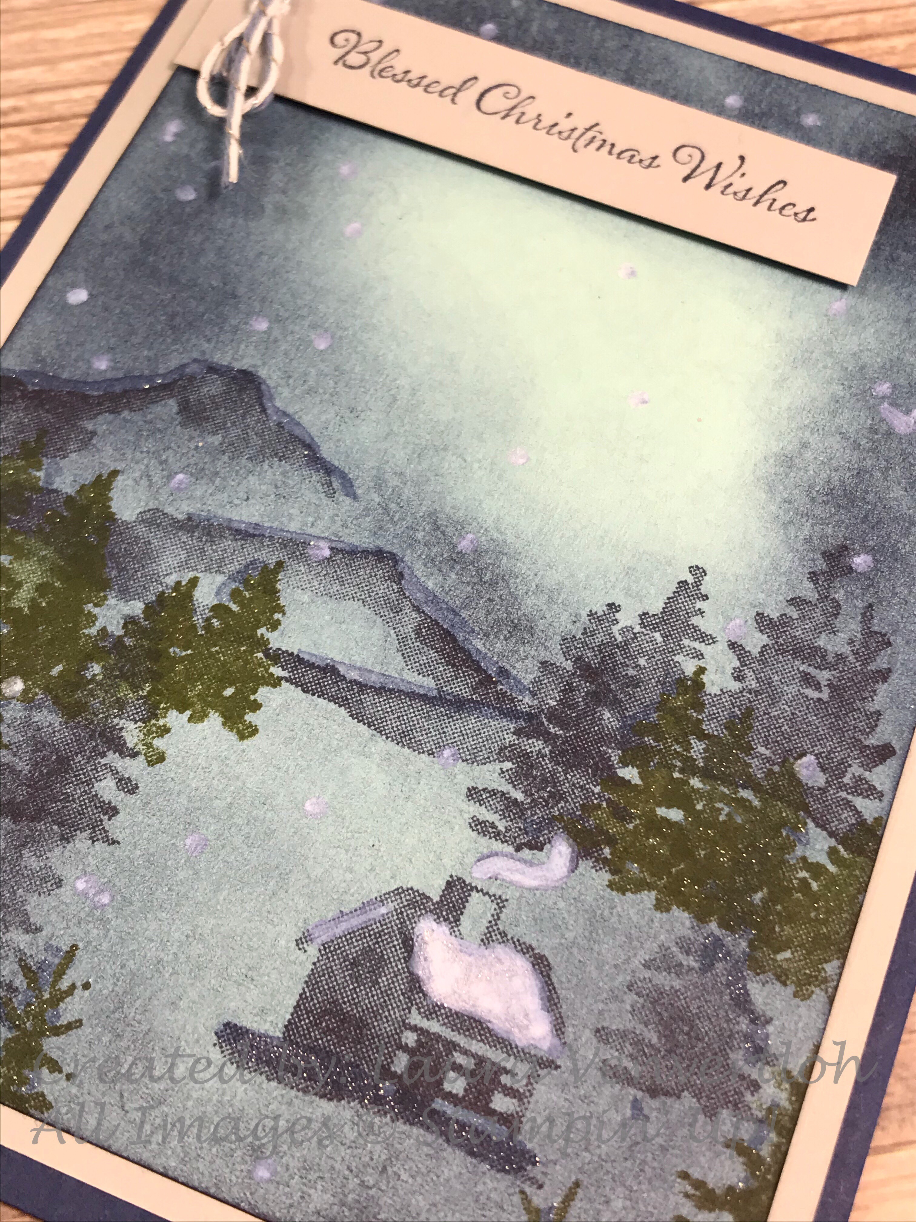 I thought about how to make it more like a peaceful Christmas Scene and came up with Pool Party as my card front piece to sponge. Your fingers will get a little inky-but that’s a good day in my book! I used a Stampin’ Sponge (I cut into 1/4’s) and some Night of Navy ink to sponge from the edge towards the area I wanted to be the “lights”.