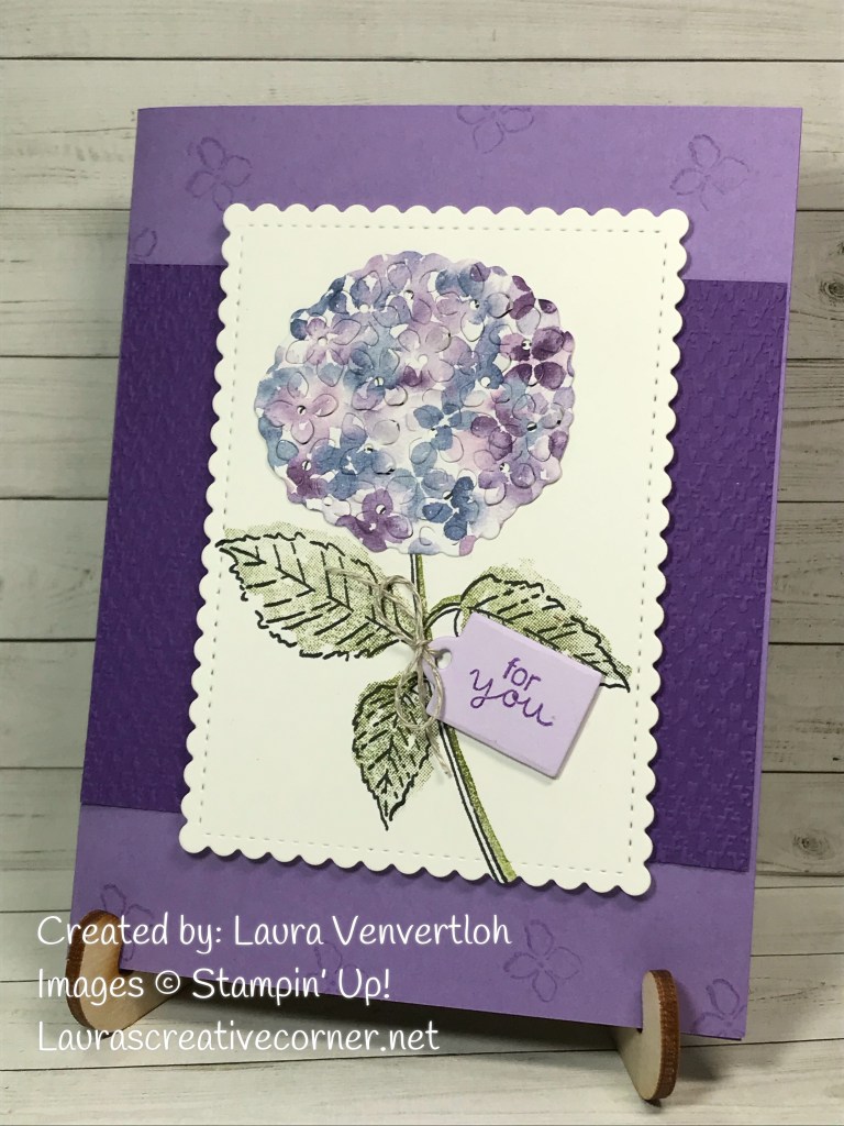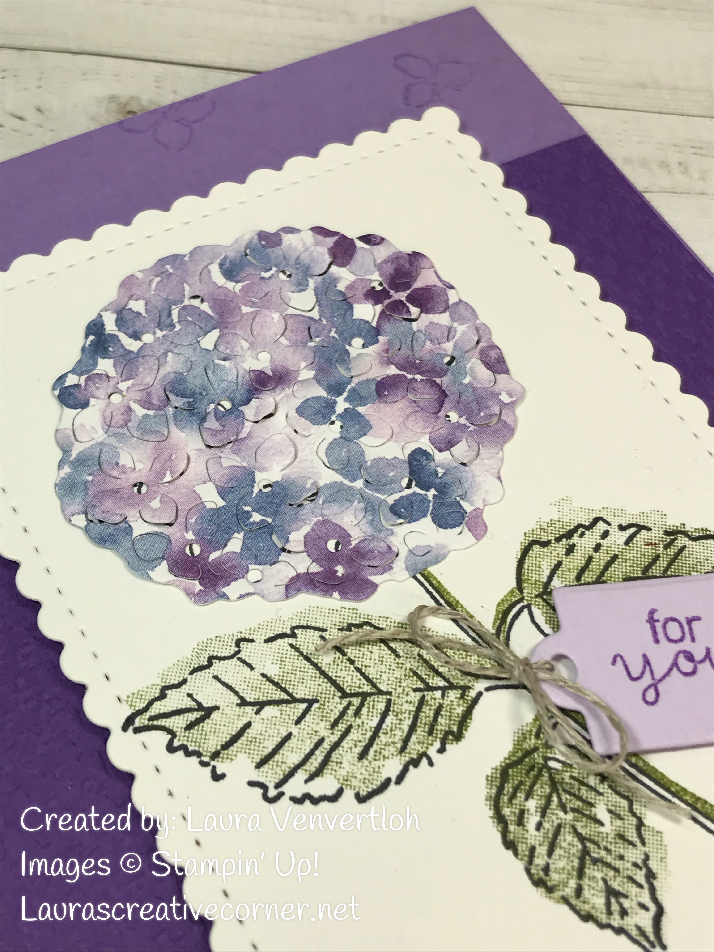 The background was randomly stamped using Highland Heather with the small single bloom (it looks like a small butterfly too, bonus!) with color on color. The small tag is part of the Hydrangea Dies and there are several sentiments in the Hydrangea Haven stamp set.