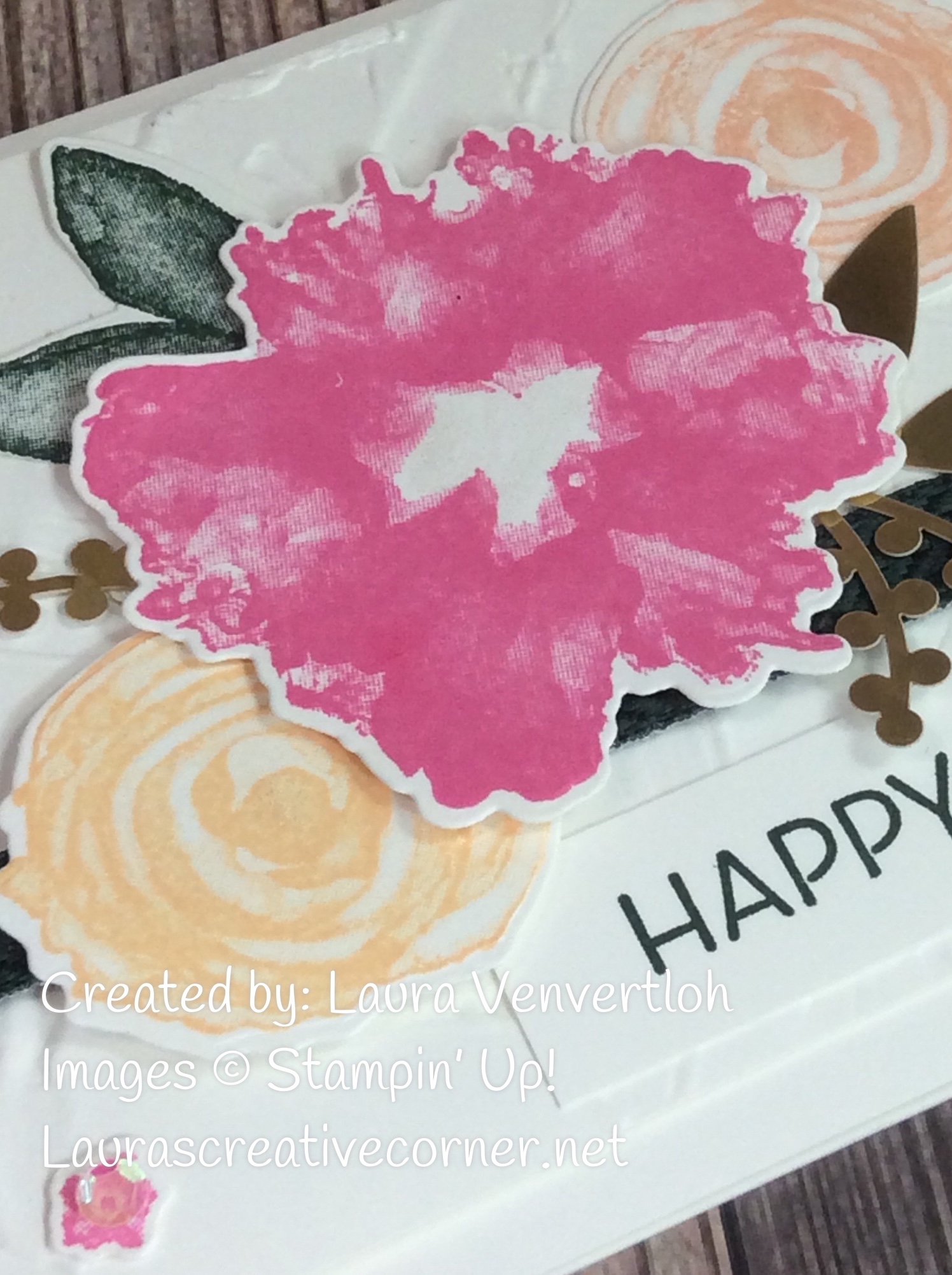 I had to get it when I was able to pre-order and I made this beauty at our retreat last month! It will be used for one of our club cards this month too! I used the Expressions in Ink DSP to discover my color scheme for the inks on this card. I love how the Polished Pink and Pale Papaya pop off one another! And the Evening Evergreen 3/8″ Chevron Weave ribbon grounds the focal point!