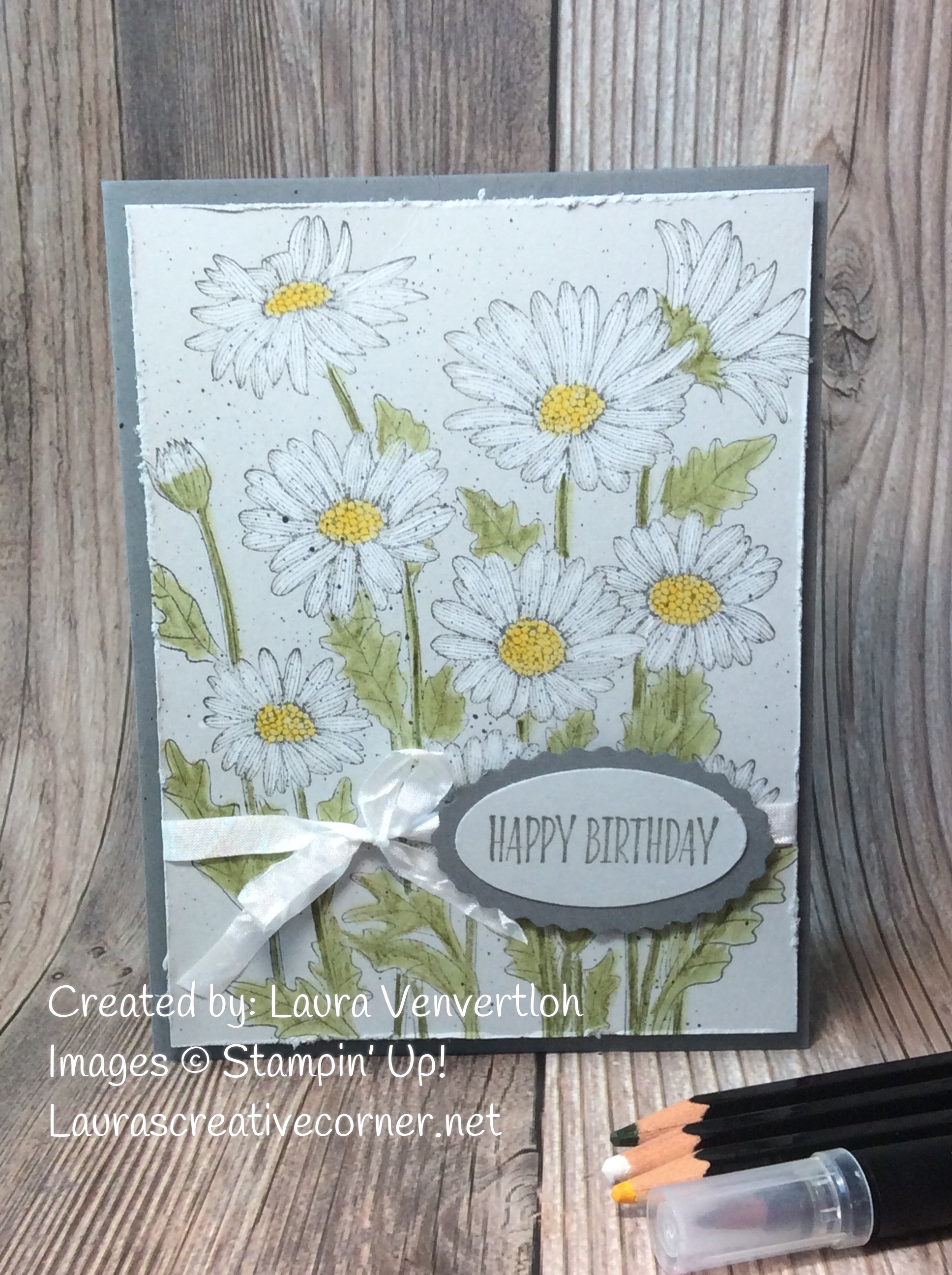 This card was simple to make, it just took a little bit to color with the Watercolor Pencil Assortment. It was soooo worth it too! I first stamped the daisies on the 4″x 5 1/4″ Smoky Slate piece using Basic Gray ink. Then I took out the Whisper White, Daffodil Delight, and Old Olive watercolor pencils and colored the images. I will tell you these are my favorite watercolor pencils! They blend and make gorgeous watercolor wash backgrounds! You have to have both assortments in your stash!