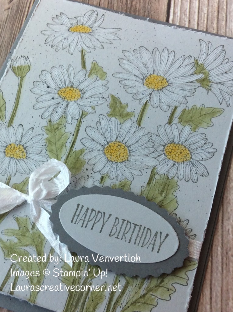 Don’t you just love a stamp set that is all in one and can make such an impact on your finished project? I fell in love with the Daisy Garden background stamp when I saw the sneak peek of the Annual Catalog! And it coordinates well with our daisy punches and the Daisy Lane stamp set perfectly! Just imagine all the cards, pages, and other creative projects you can dream up!