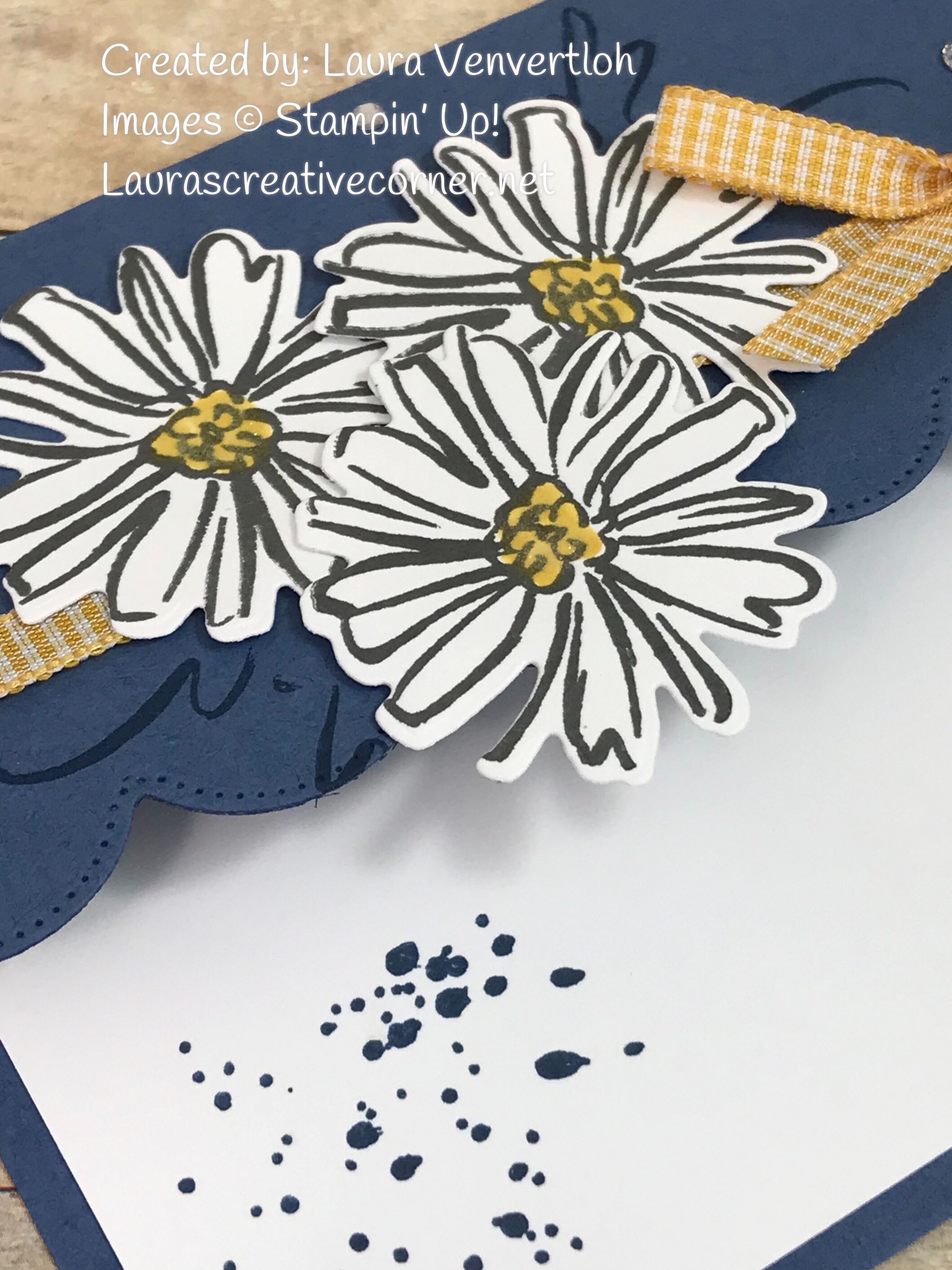 Stamp your 3 daises with Basic Gray ink and color the centers with a Daffodil Delight Stampin’ Write marker. Cut them out using the coordinating dies. All that is left is stamping and the embellishments. Stamp your inside Basic White piece with the sentiment of your choice and the splatter stamp towards the bottom of the card so you see it. Adhere that to the inside of the card. Next, stamp the leaves closed to where you will adhere your daisies and then the splatter to add a little visual interest.