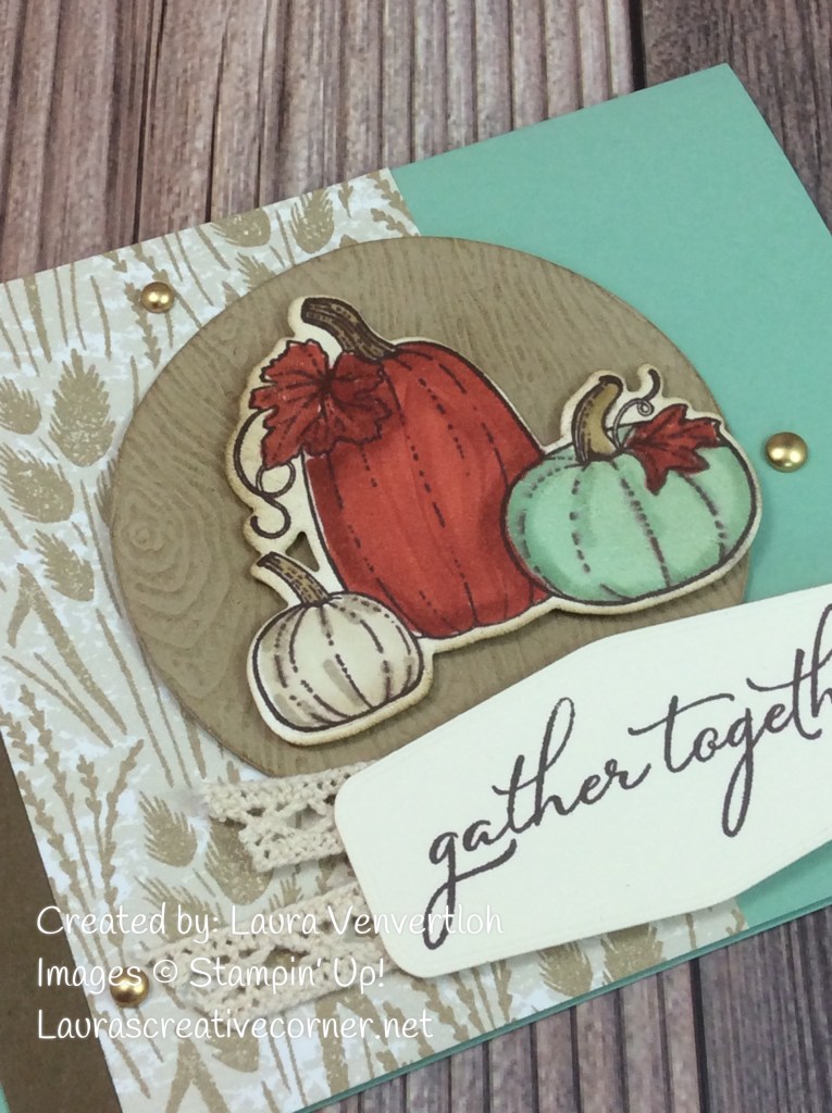 I finished up the card with some Brushed Metallica Adhesive Backed gems and some Diamond Weave Ribbon tucked behind the sentiment. Oh, and don’t forget a little Wink of Stella on the pumpkin leaves!