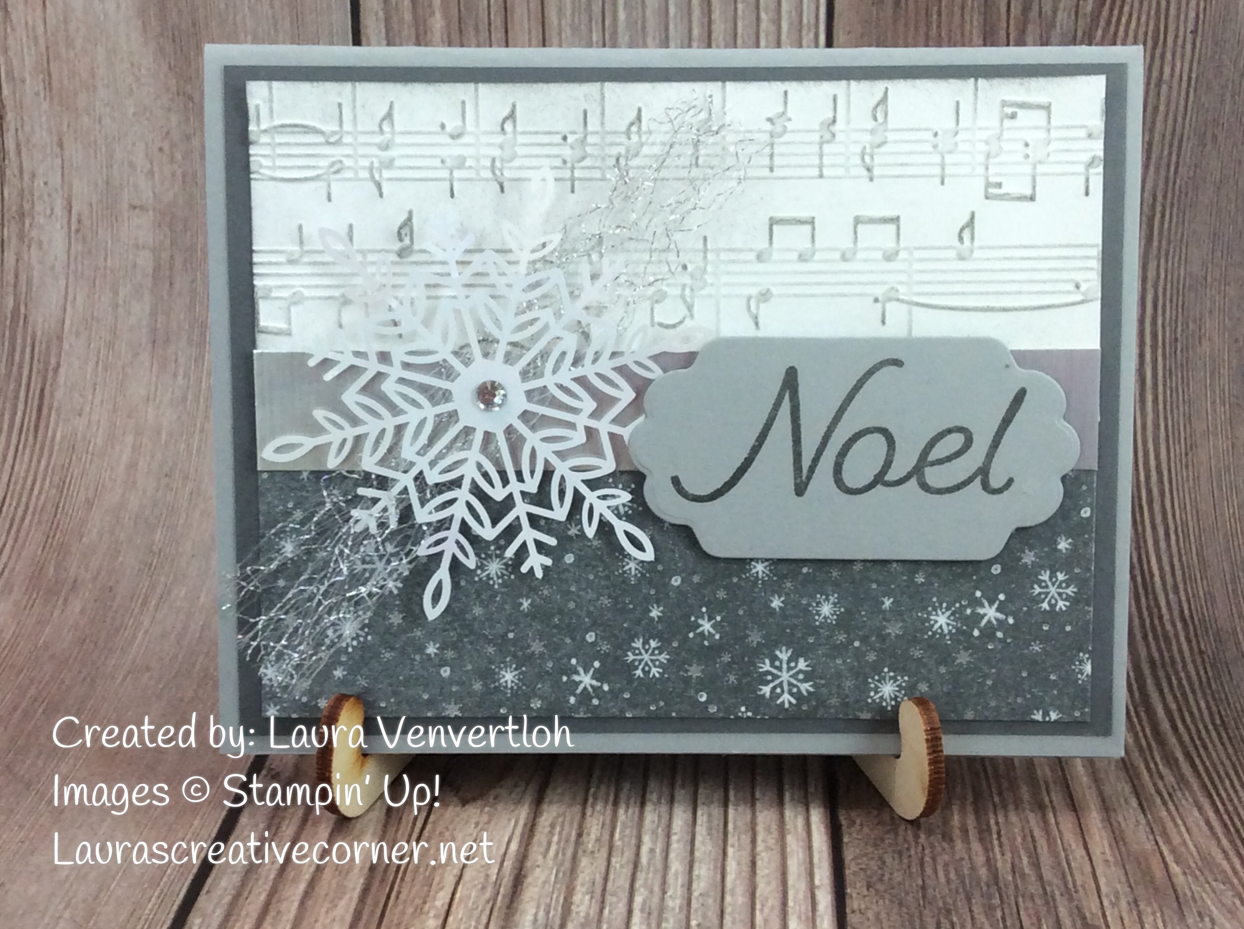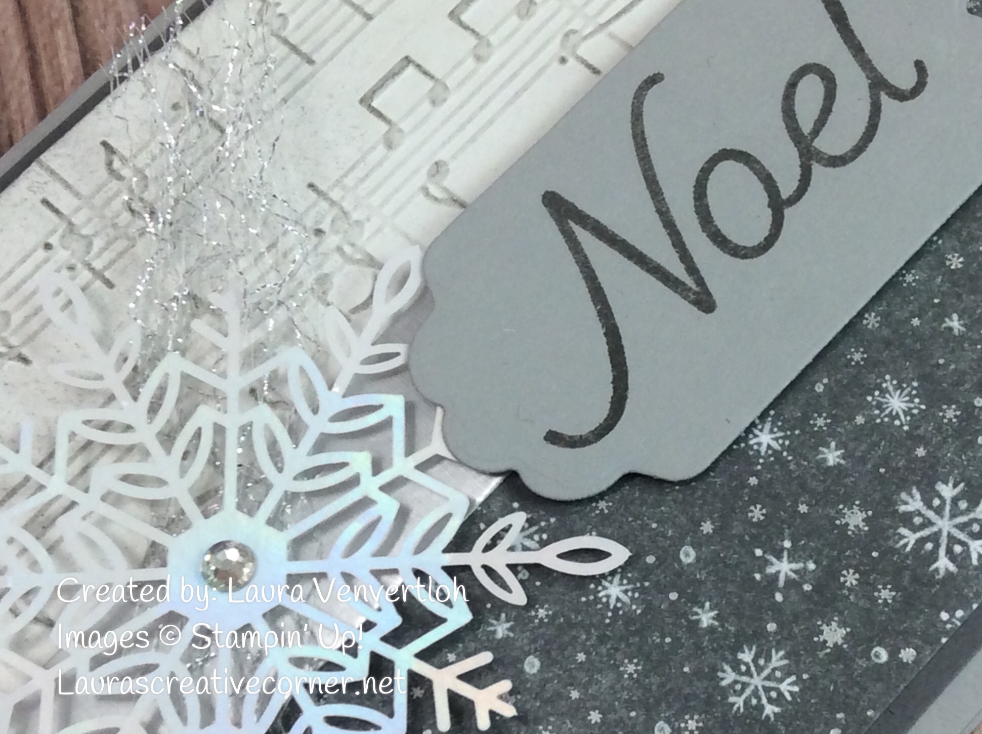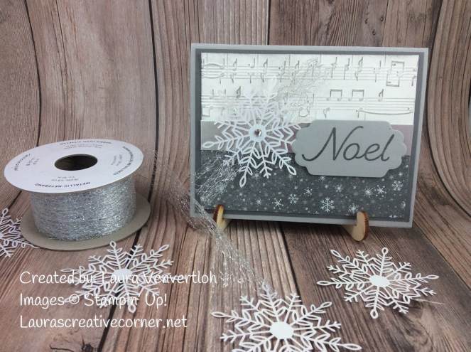 The sentiment is stamped from the Happy Hollydays stamp set and cut out with the smaller label in the Seasonal Labels dies. I loved the size and simplicity of this sentiment. To add more pop, use a Dimensional in the center of the Snowflake (well done Stampin’ Up!-it is the perfect size!). The Silver Mesh ribbon is a lovely touch since it is so dainty, but delivers such a wow on your projects! I just snipped a tiny bit and pinched it in the center before I placed the snowflake on top. The snowflake looked so much better with the ribbon and the Basic Rhinestone on top!