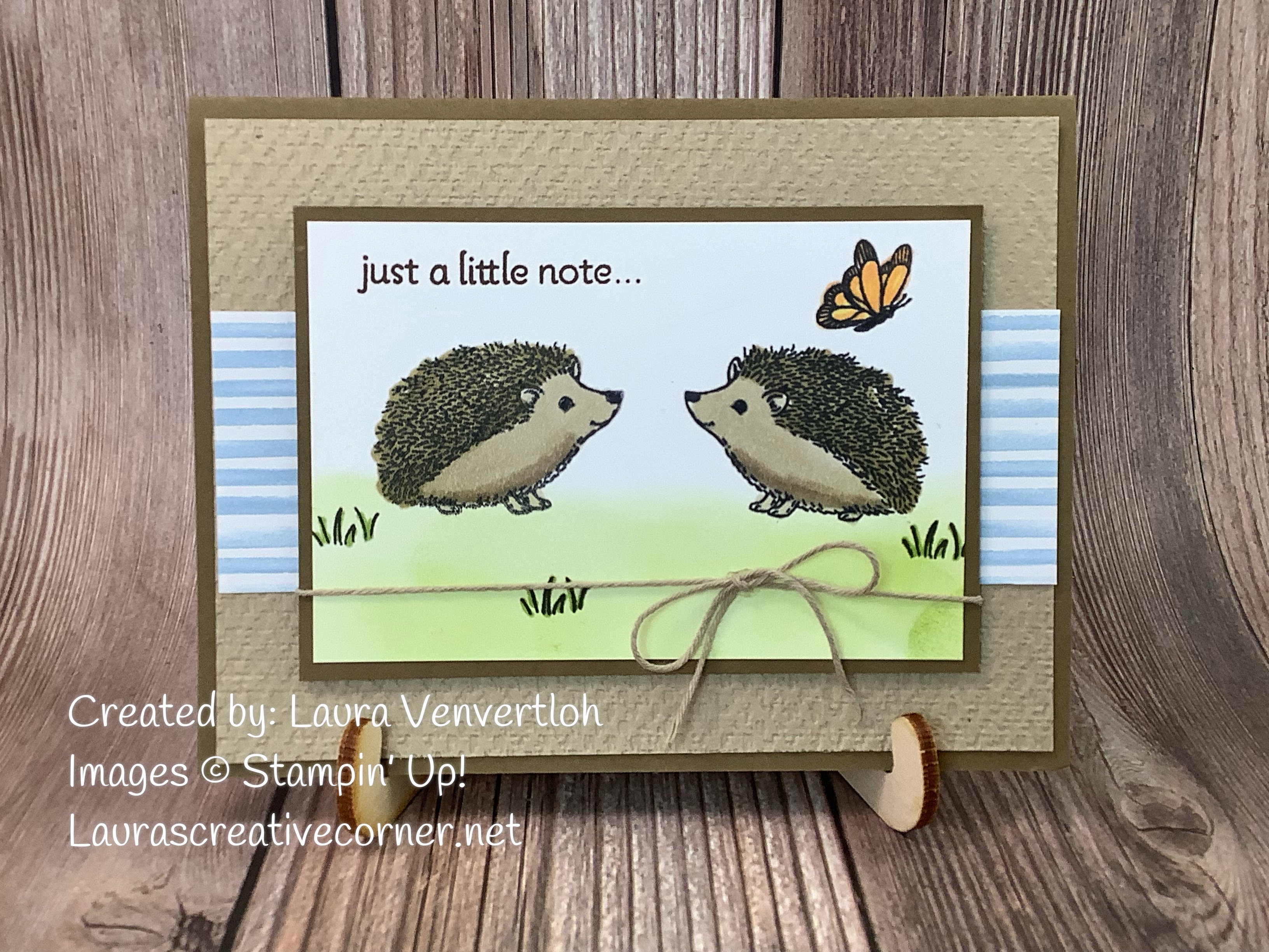 I used a Blending Brush and Granny Apple Green to create the green grass area paired with the blades of grass stamp. I colored in the grass blades with the Granny Apple Green Blends. For the hedgehogs, I used both light/dark Crumb Cake and light Soft Suede. The butterfly was colored with light/dark Pumpkin Pie Blends. I attached that piece to a Soft Suede mat and adhered it using Dimensionals. To finish the card, I tied a bow with Linen thread.