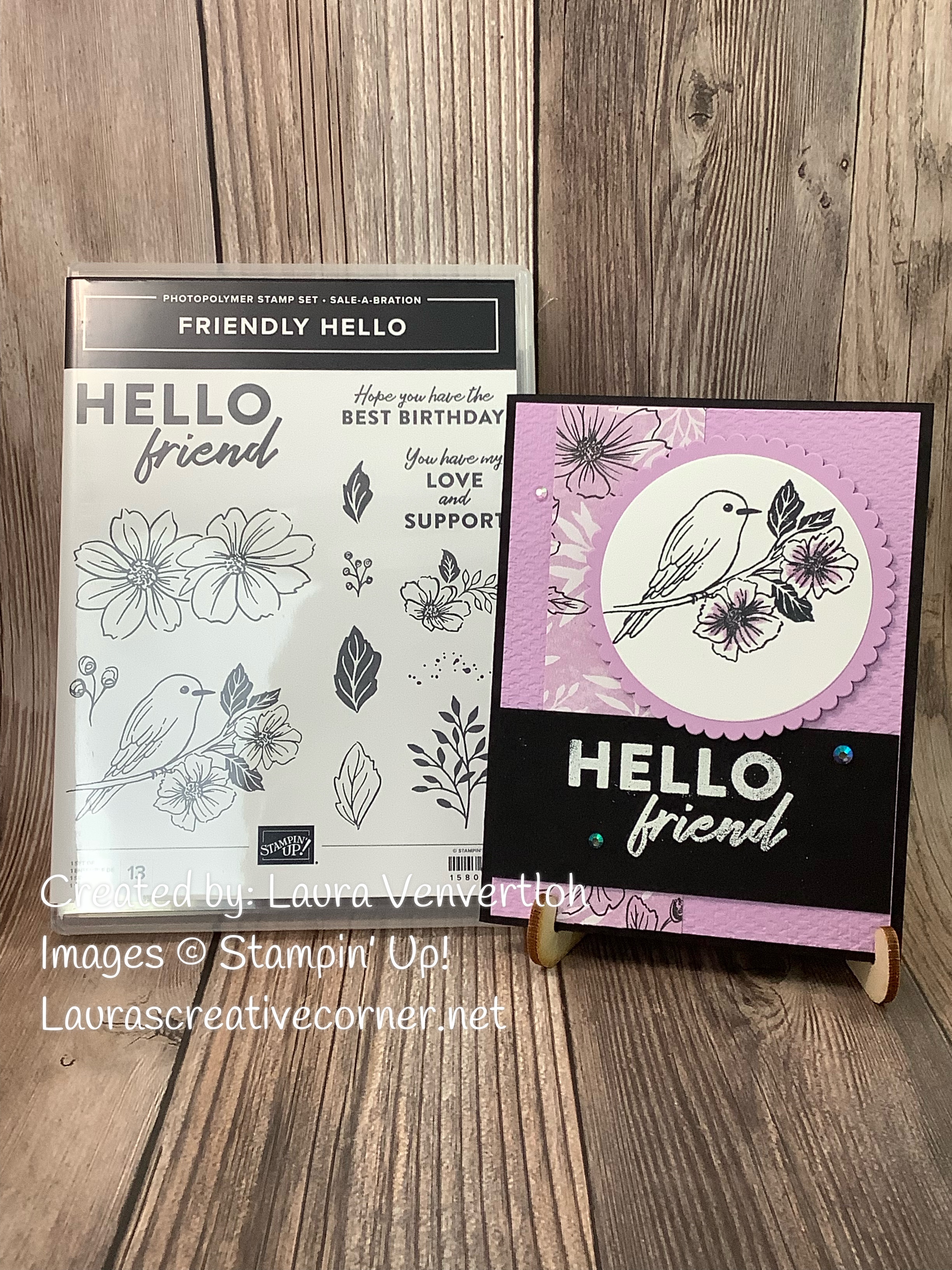 I wanted to share my FAVORITE Free Item in the Sale-a-Bration Catalog! This card just summons springtime and warmth with it’s cheerful, springy colors! The Friendly Hello Bundle is FREE when you spend $100. Isn’t it hard to believe that the first month of Sale-a-Bration is already gone?!
