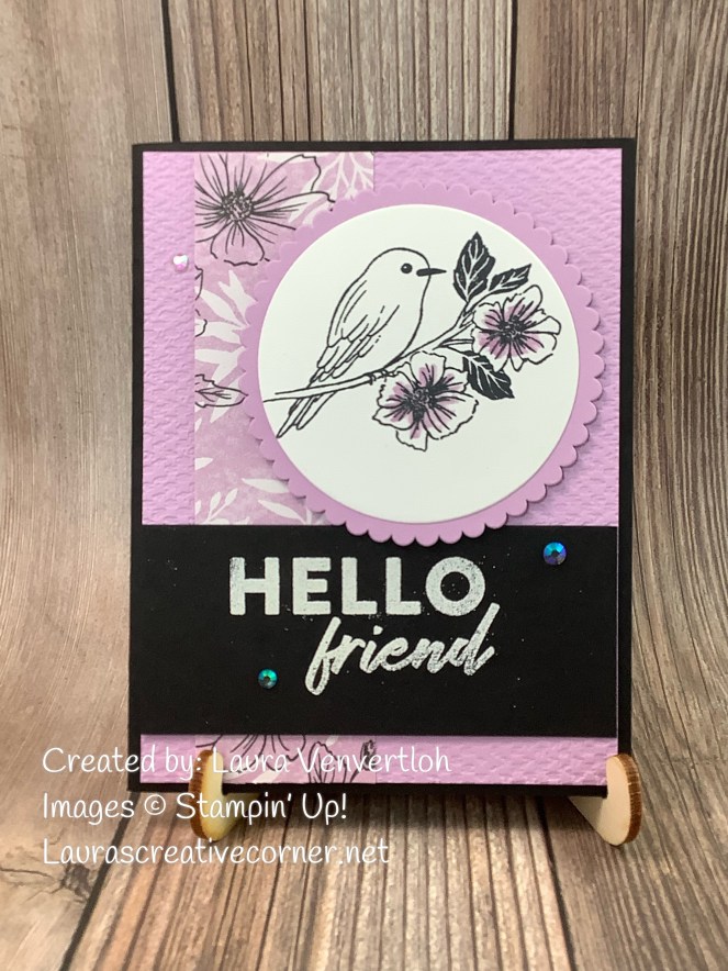 I cut a 2″ x 5 1/4″ piece of the Fresh Fresia floral page from the DSP pack and glued that down on top of the dry embossed Fresh Fresia. On a piece of Basic White, I stamped the sweet little bird on the floral branch with Black Memento. To add a little shading, I added some Fresh Fresia Ink on my Blender Pen and followed up with Wink of Stella Clear. I used the Layering Circles to cut it out along with the Fresh Fresia scalloped mat circle.