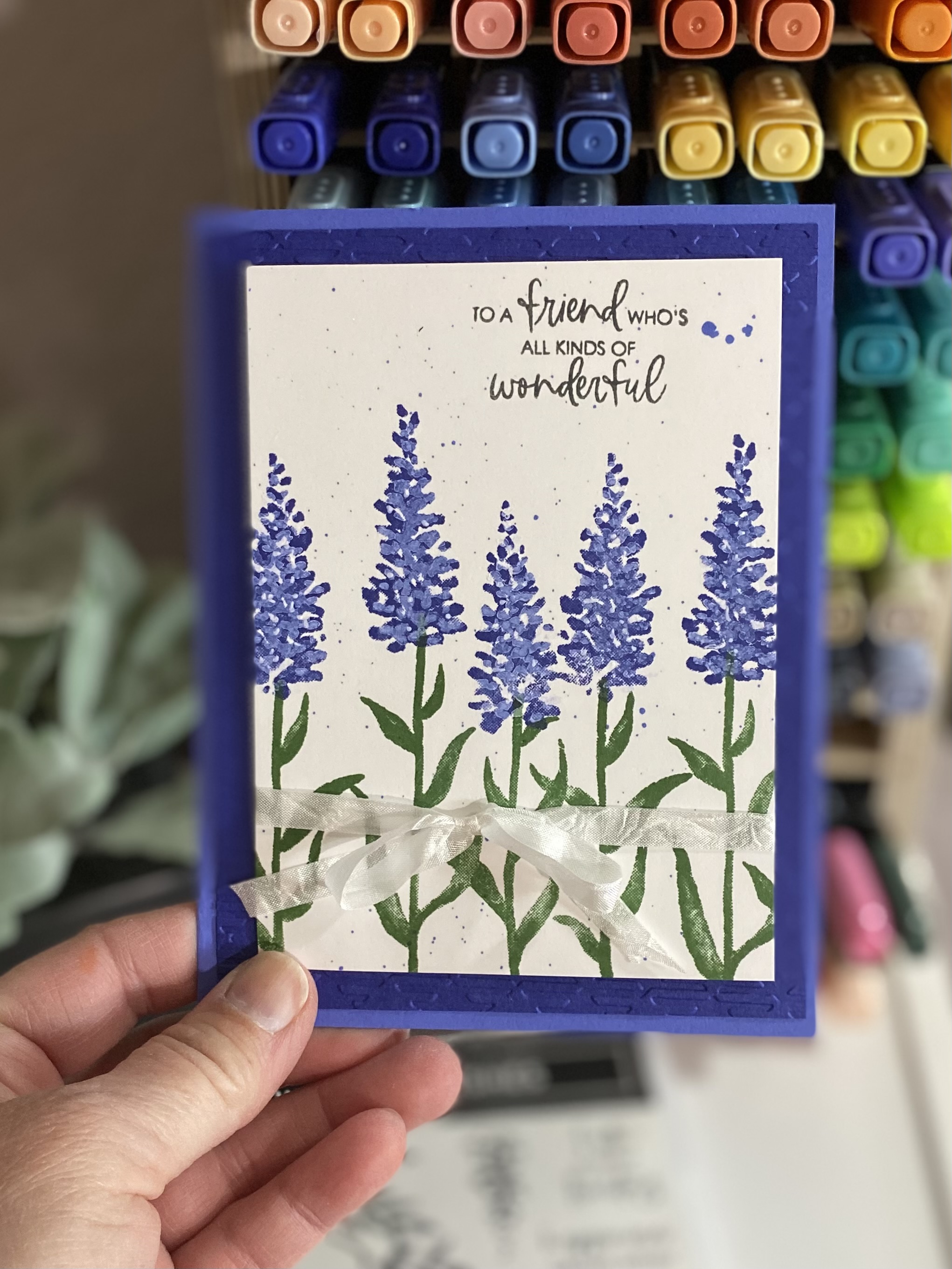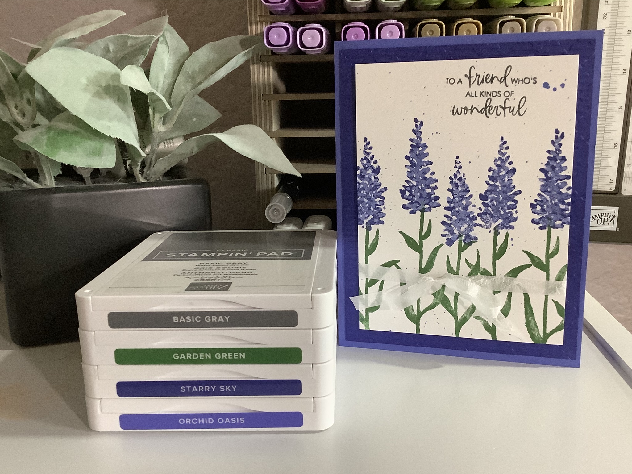 We got a copy of the new catalog in April, and we were able to pre-order selected items last month. So, when I cruised through and saw the Wisteria Wishes bundle, I HAD TO HAVE it!! I adore wisteria flowers in bloom! I also saw making bluebonnets by stamping the image upside down! Bluebonnets are the Texas state flower and the two new In Colors were perfect for making this vision come to life!