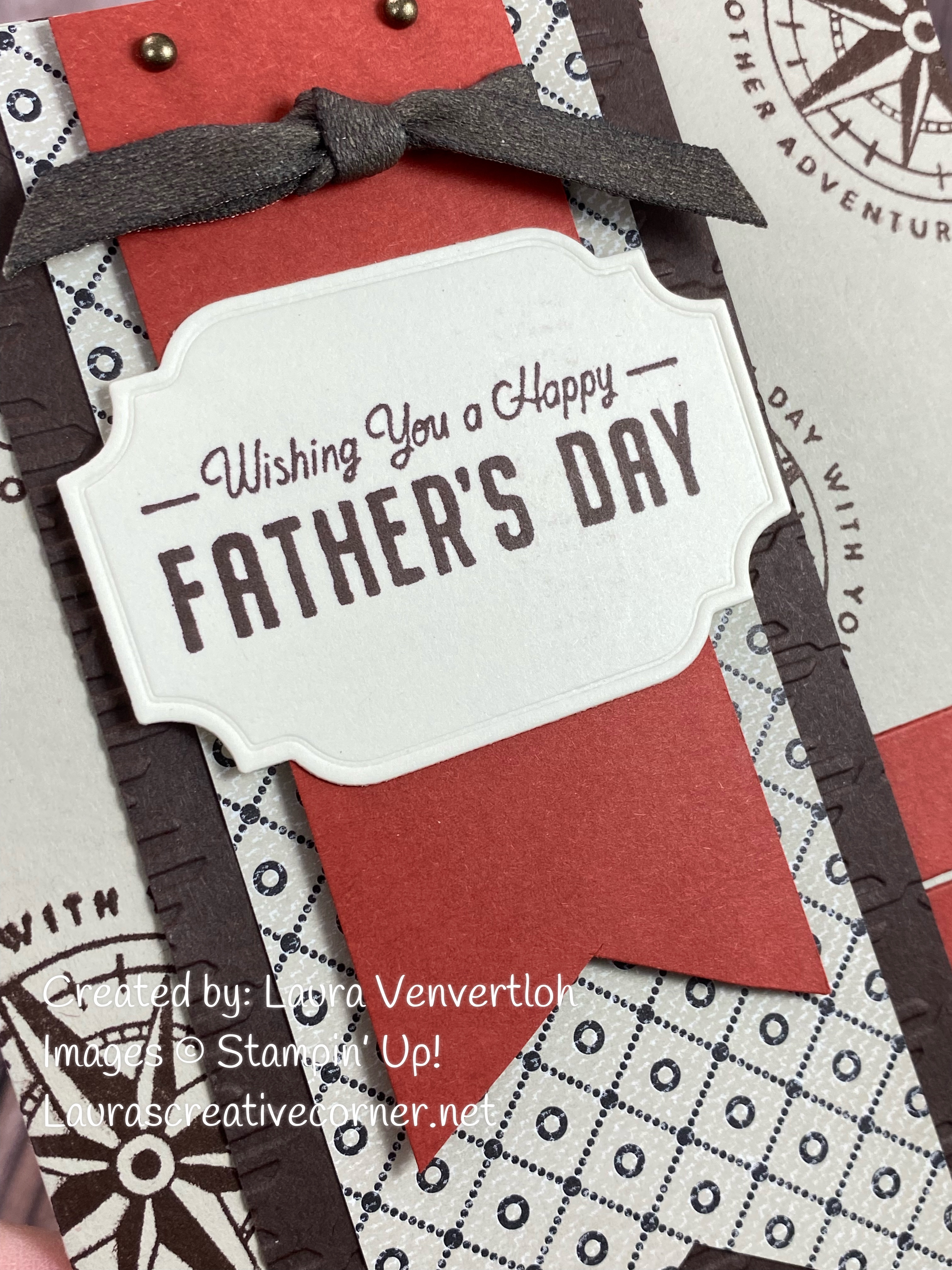 To finish off the card, I used the Early Espresso 1/4″ Faux Suede Ribbon and Rustic Metallic Adhesive Backed Dots towards the top of the banners. I did tuck in three of the smaller banners plus die cut one of the shapes with the Father’s Day sentiment.