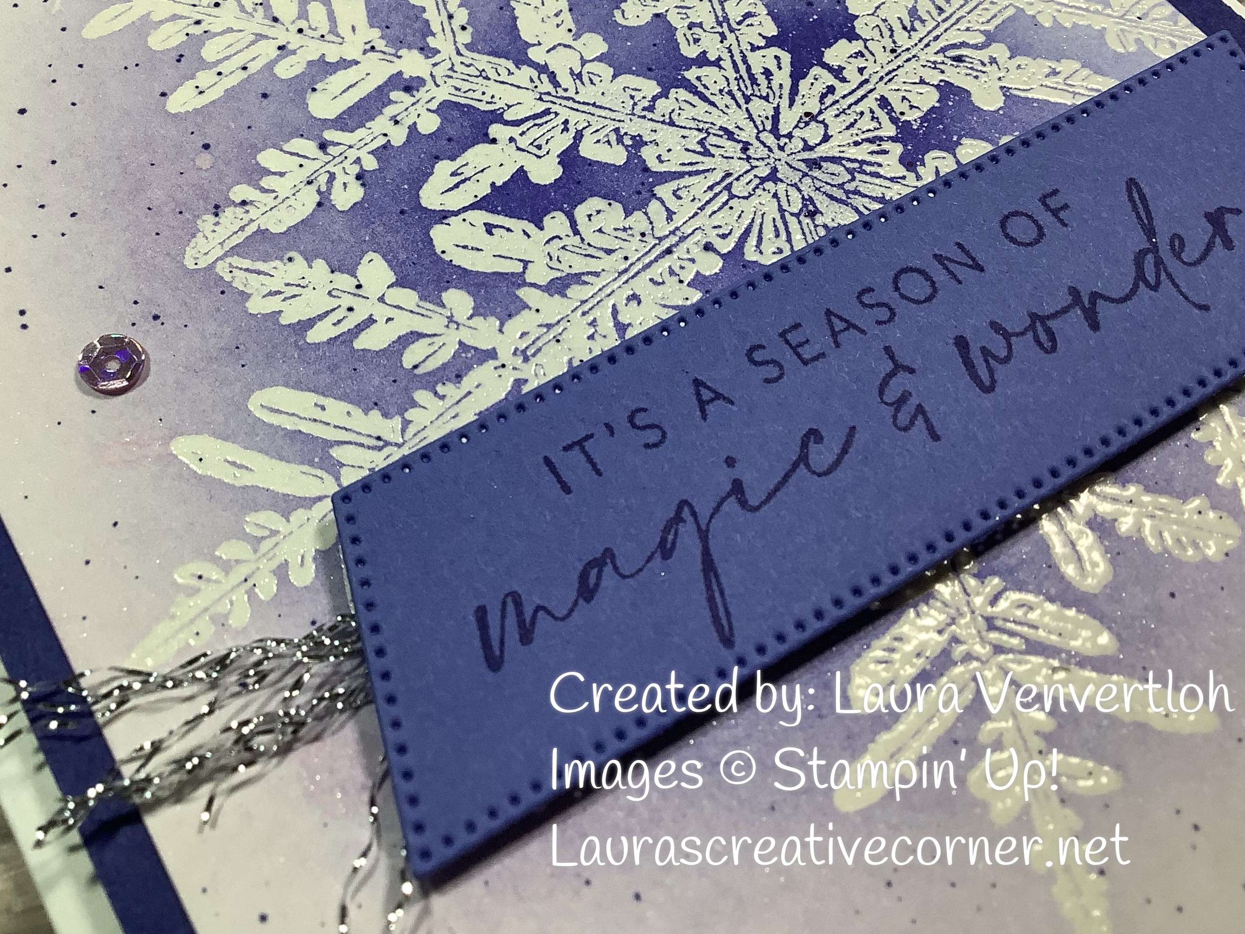 First you will need to stamp the Snow Crystal stamp with VersaMark onto ap piece of Shimmery White (or light cardstock) and sprinkle Clear or White Embossing powder on top. Heat set once you have tapped off the excess powder. Give it a few seconds to cool down. I used the Blending Brushes with Orchid Oasis Ink Pad & Fresh Fresia Ink Pad to create the gradual ombre effect! It’s ok to keep going back to re-apply the inks. It helps blend them together and makes the saturation more in depth. Take a paper towel and wipe the embossed image to make it pop! Did you notice the speckles? I just took a Bone Folder and tapped firmly against it with the Starry Sky Stampin’ Blends and followed up with Wink of Stella Clear.