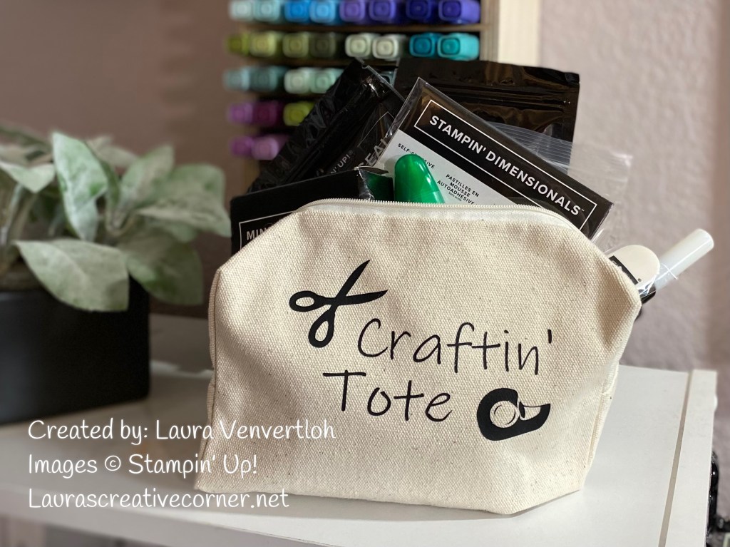 NEW! Just in time for the gift giving season! Do you have a crafter in your circle? These adorable Craftin’ Totes are FREE with the purchase of the Essentials Pack (Stampin’ Seal, Stampin’ Seal refill, Stampin’ Dimensionals, Mini Glue Dots, Liquid Glue, Fine Tip Glue Pen, Bone Folder, and Paper Snips). Order those items using this month’s host code or I can enter them for you! I will mail/deliver the FREE Craftin’ Tote! Need it personalized? Just ask! While supplies last! Also comes in Black Canvas!