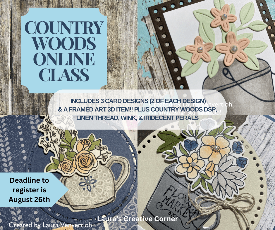 This month’s Online Class features the Country Woods Suite & includes 3 card designs (2 of each design) & a framed art 3D item (1 frame included)! You’ll receive enough consumable project supplies: 1/2 pack of Country Woods DSP, a full spool of Linen Thread, 1 Wink of Stella, & a package of Iridescent Pearls! Add-on options available too!