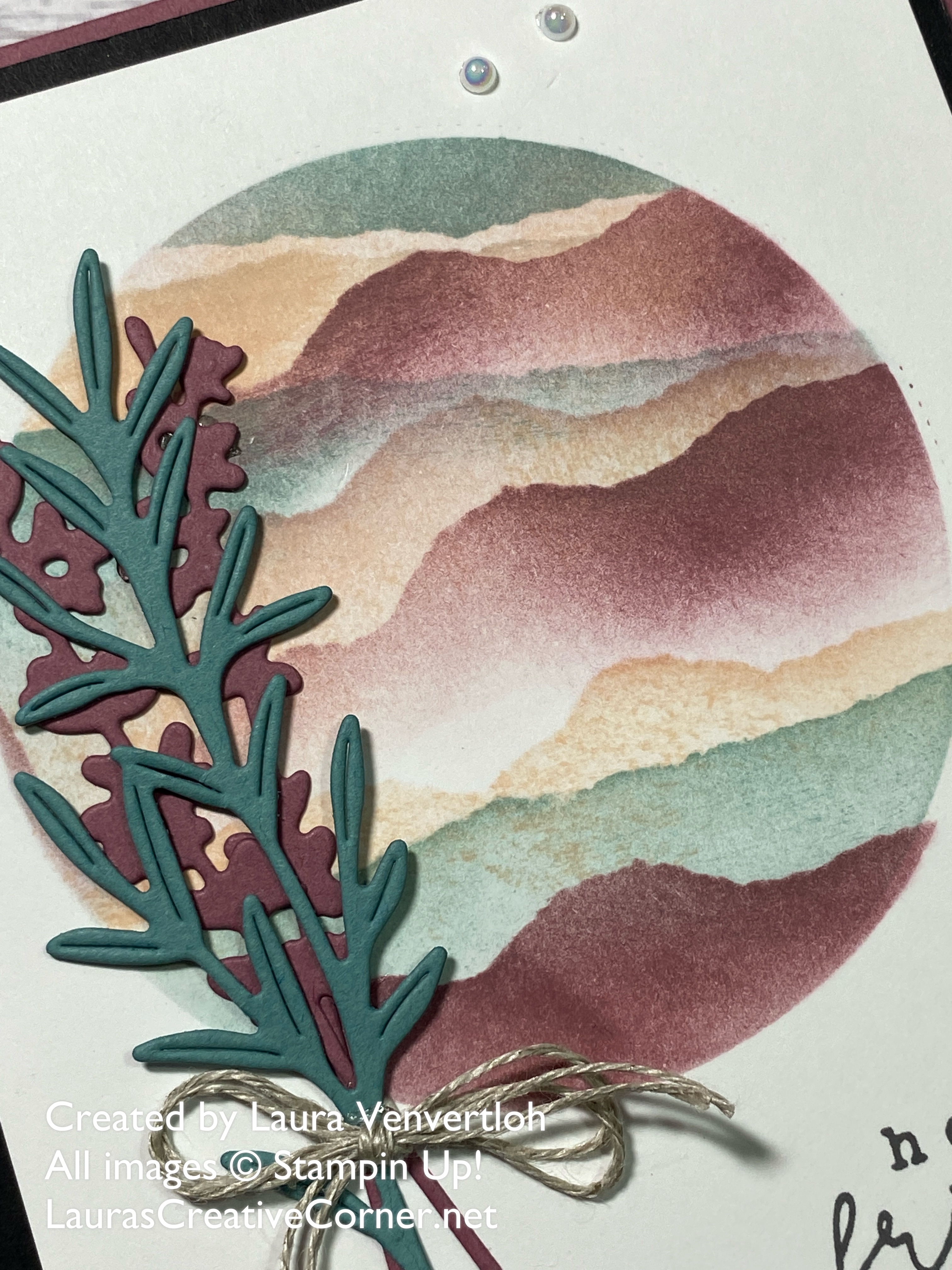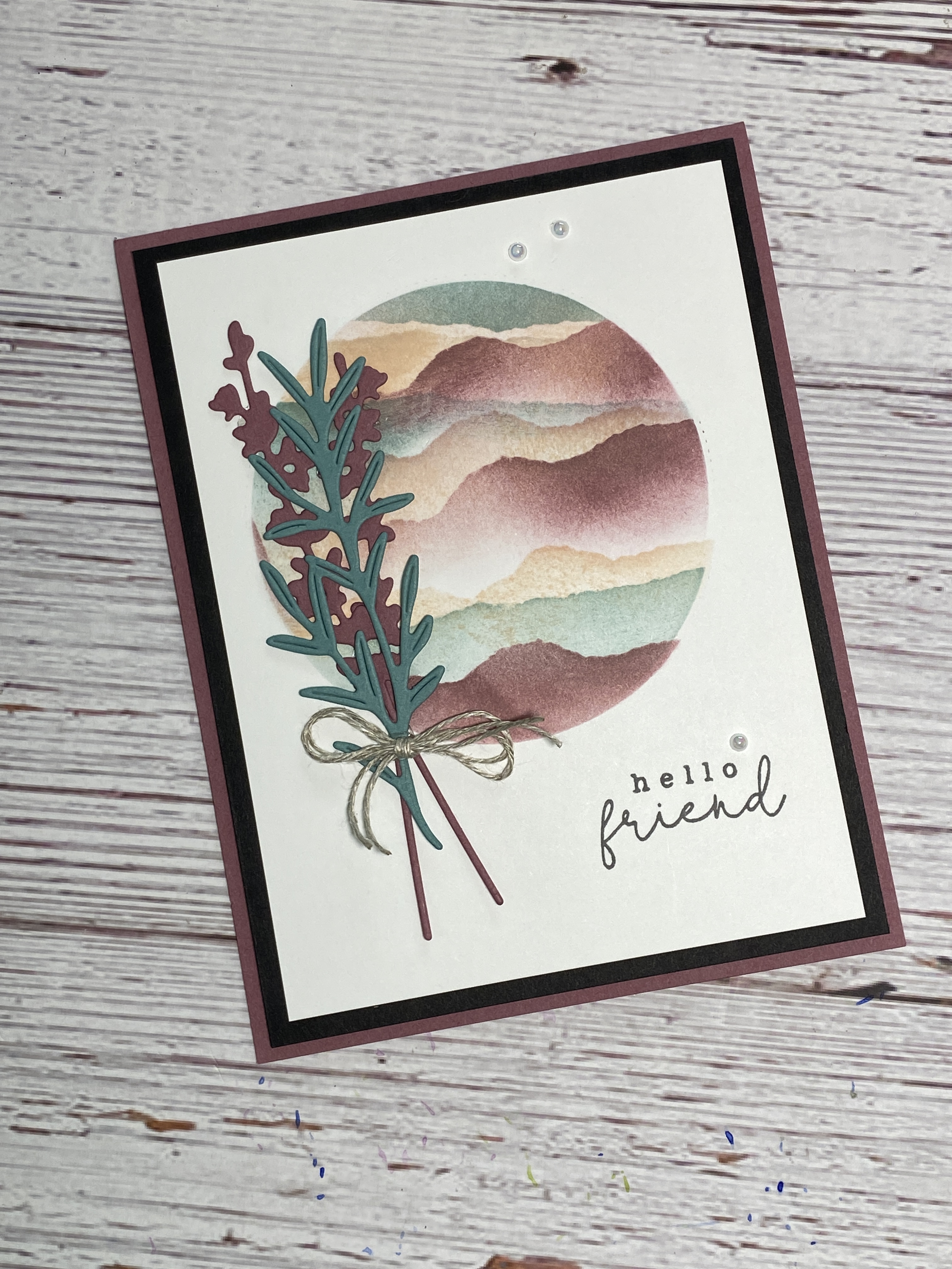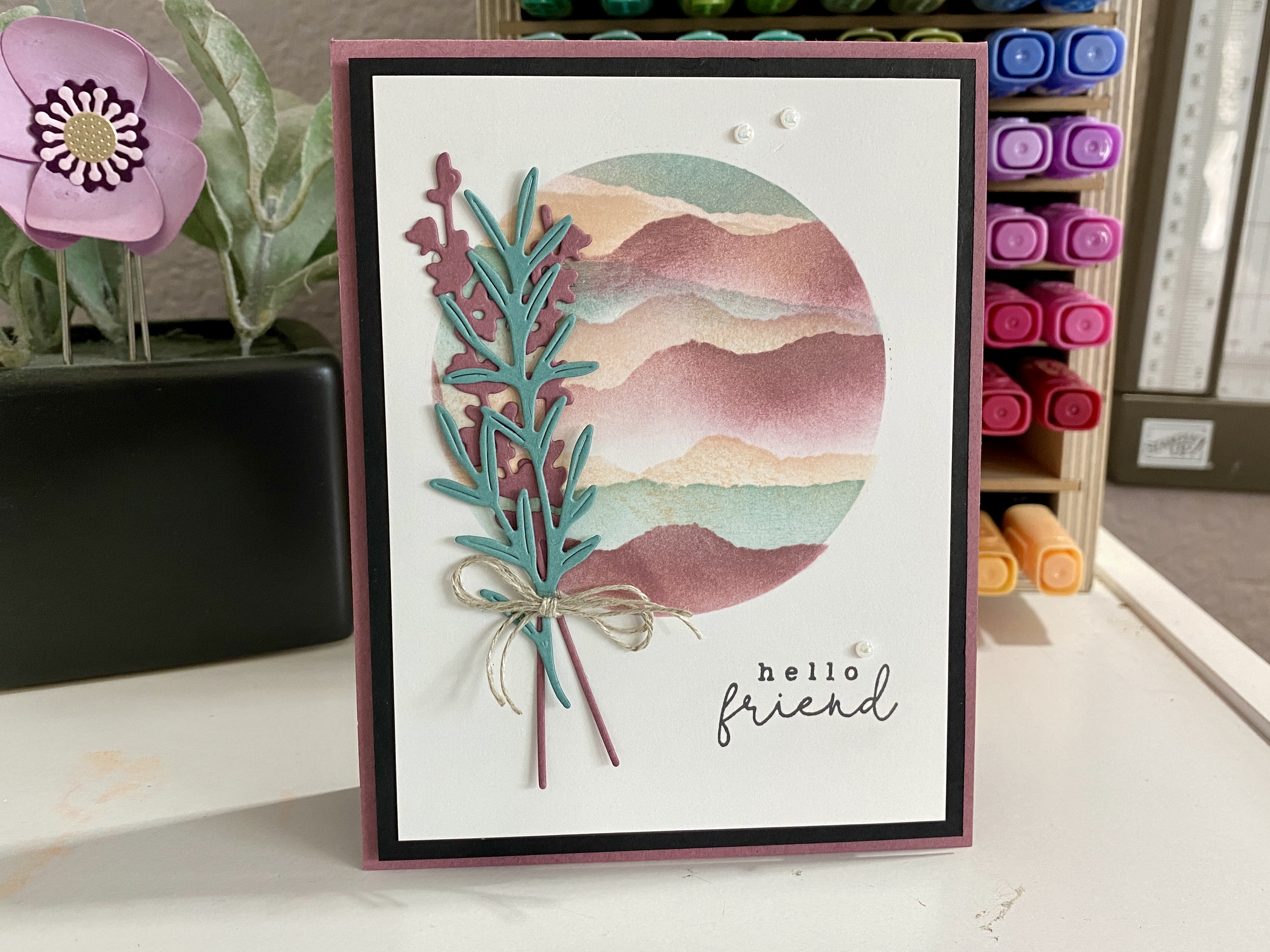 I used the Perineal Lavendar dies for the sprigs with Moody Mauve & Lost Lagoon cardstock. It was mounted on a Basic Black mat and attached to a Moody Mauve card base. Some Iridescent Pearls, a double Linen Thread bow, and a sentiment finishes off this gorgeous card!