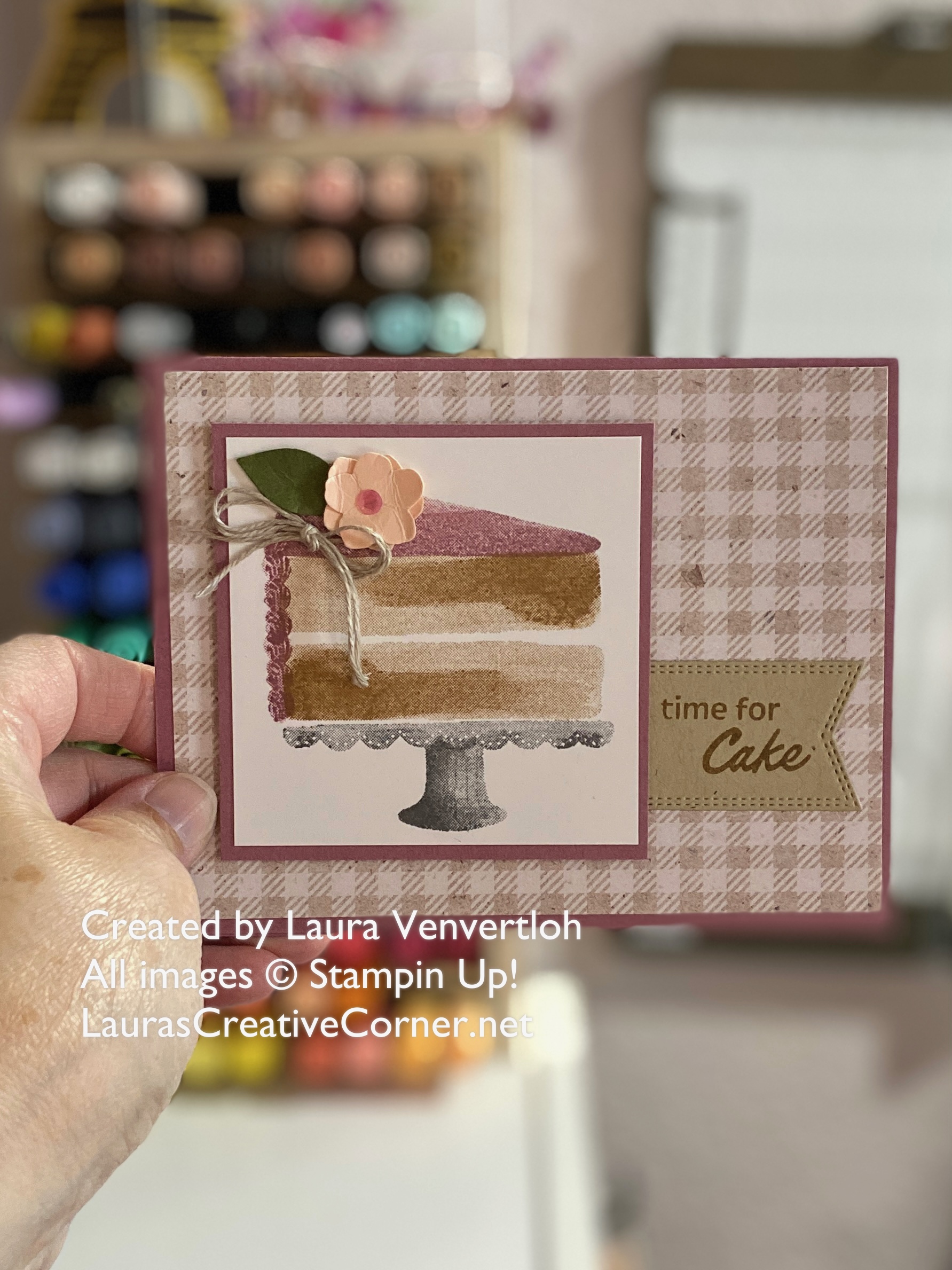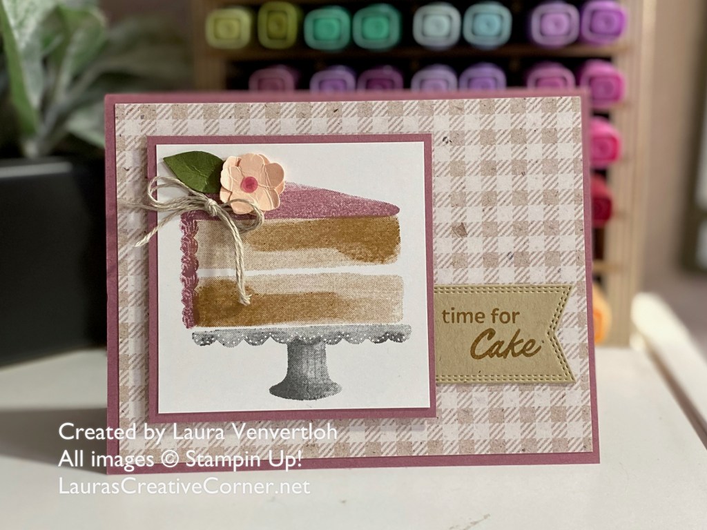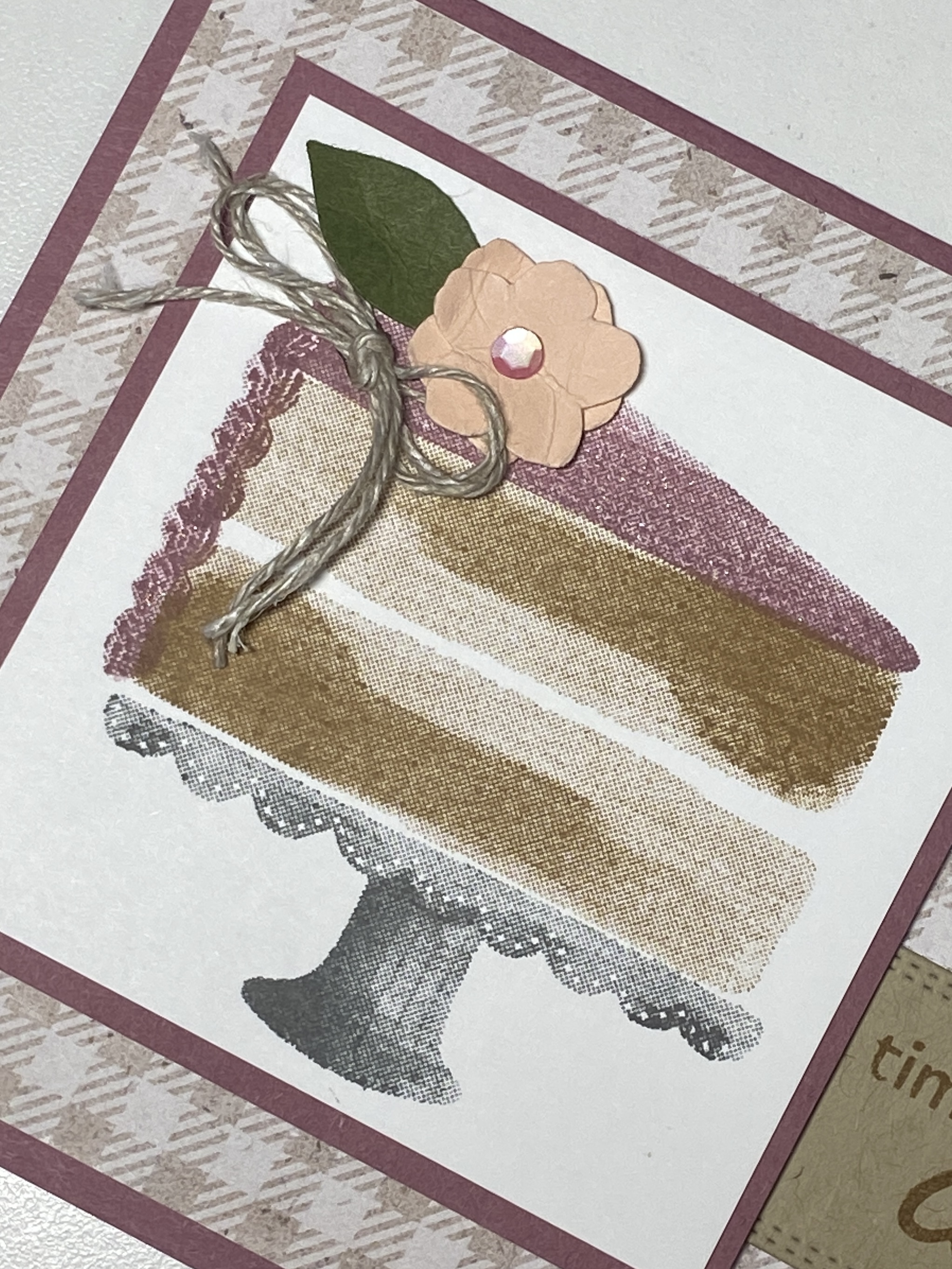 I used Moody Mauve for my card base cut to 8 1/2″ x 5 1/2″ and the mat for the cake image cut to 3 1/8″ square. The checker patterned paper from the Perennial Lavender DSP is cut to 4″x 5 1/4″ and adhered to the card base.
