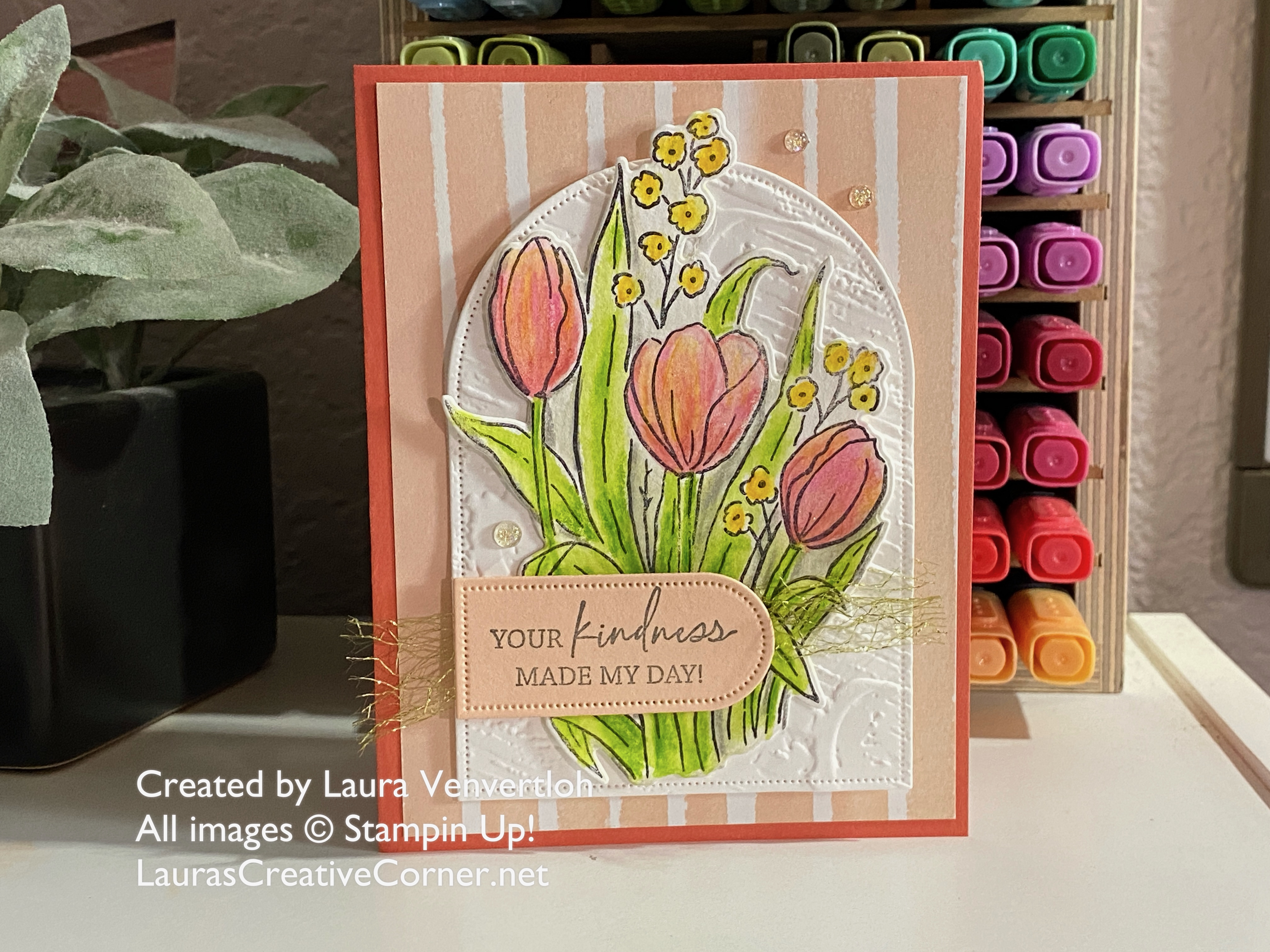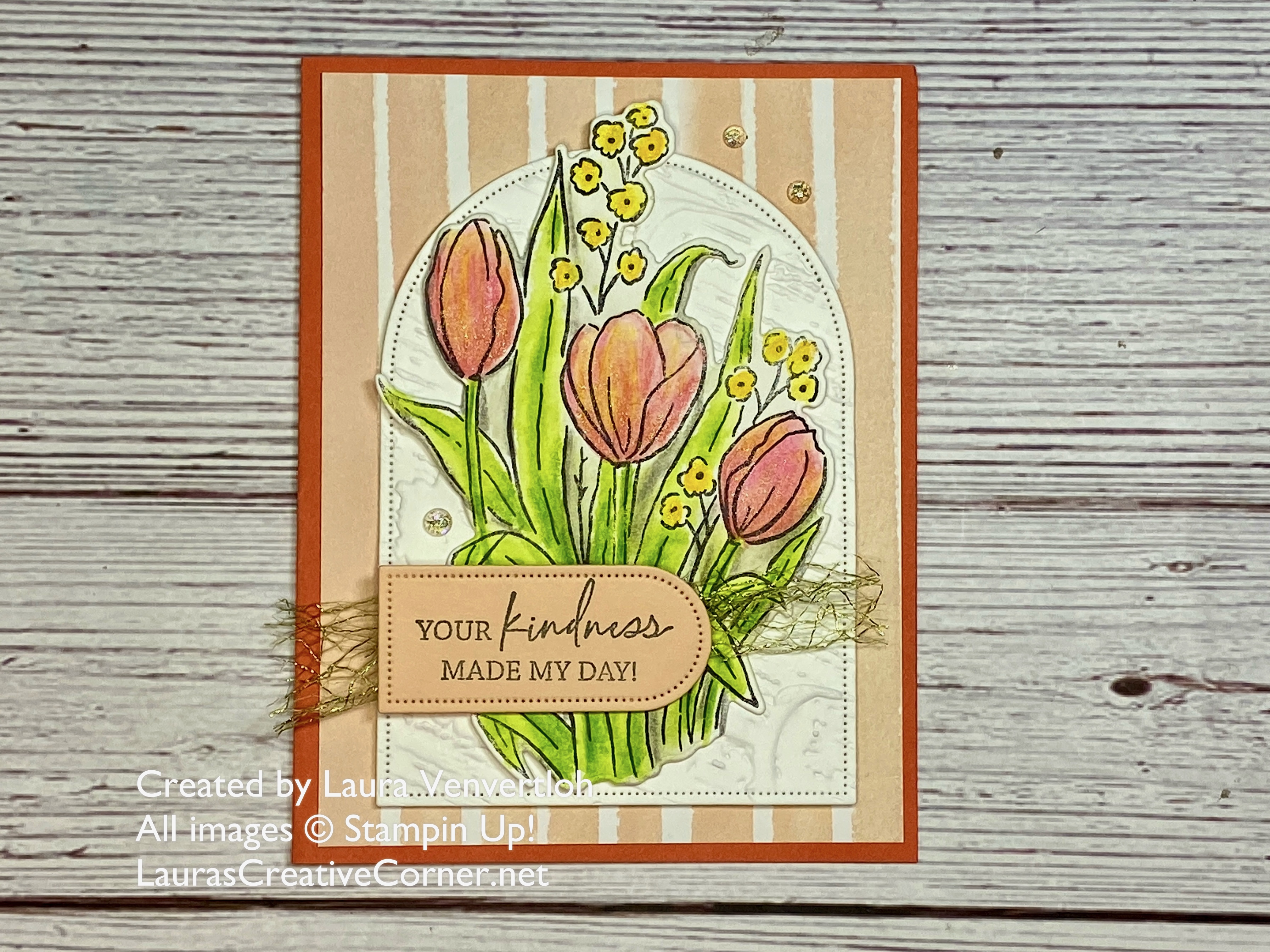 To create this card, I looked at the back of the Mixed Media Florals DSP for the color combination. I have always loved how Calypso Coral and Petal Pink play off each other. I stamped the tulips with Stazon black on our Fluid 100 Watercolor paper. Next, I used our Water Painters and the Watercolor Pencils (Flirty Flamingo, Calypso Coral, Daffodil Delight, Granny Apple Green) to color the image. Our Watercolor pencils are so smooth when you use water with them!
