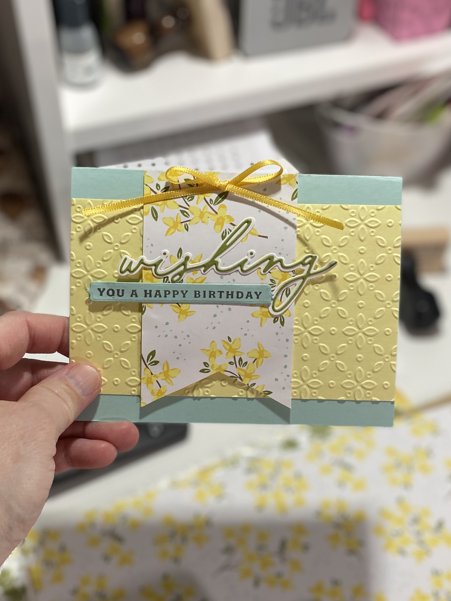 The Tiny Bee Trinkets are a must! They add just the right amount of whimsy to your creations! The Floral & Gingham Vellum can add a soft backdrop to your layouts and cards as well as the 1/8″ Daffodil Delight Ribbon!