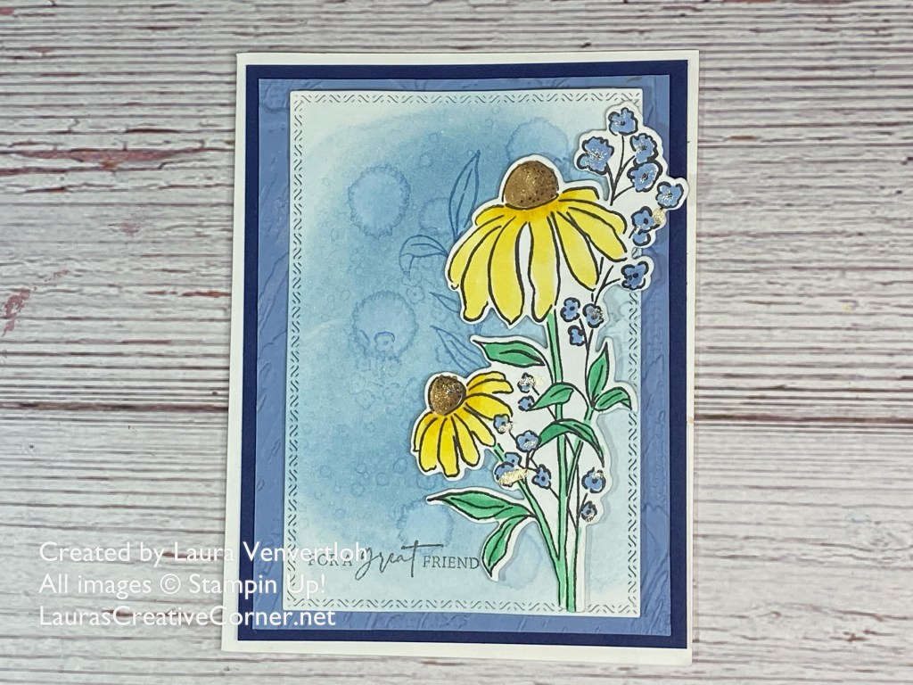 This is a really simple technique that can make your background a gorgeous focal point! All you need is Boho Blue Stampin’ Ink, a Blending Brush, and a paintbrush. I used the Basic White Thick cardstock so the water wouldn’t warp the paper as much. My first card was a tad bit curvy on the surface. It’s homemade though, right?