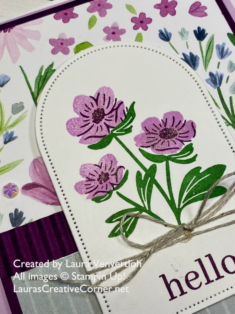 The green stems were stamped first using Garden Green towards the bottom of the arch. When I use two-step stamping, I stamp first using the lined image. I find it’s easier to hover over with the coordinating stamp to create the flower shape.