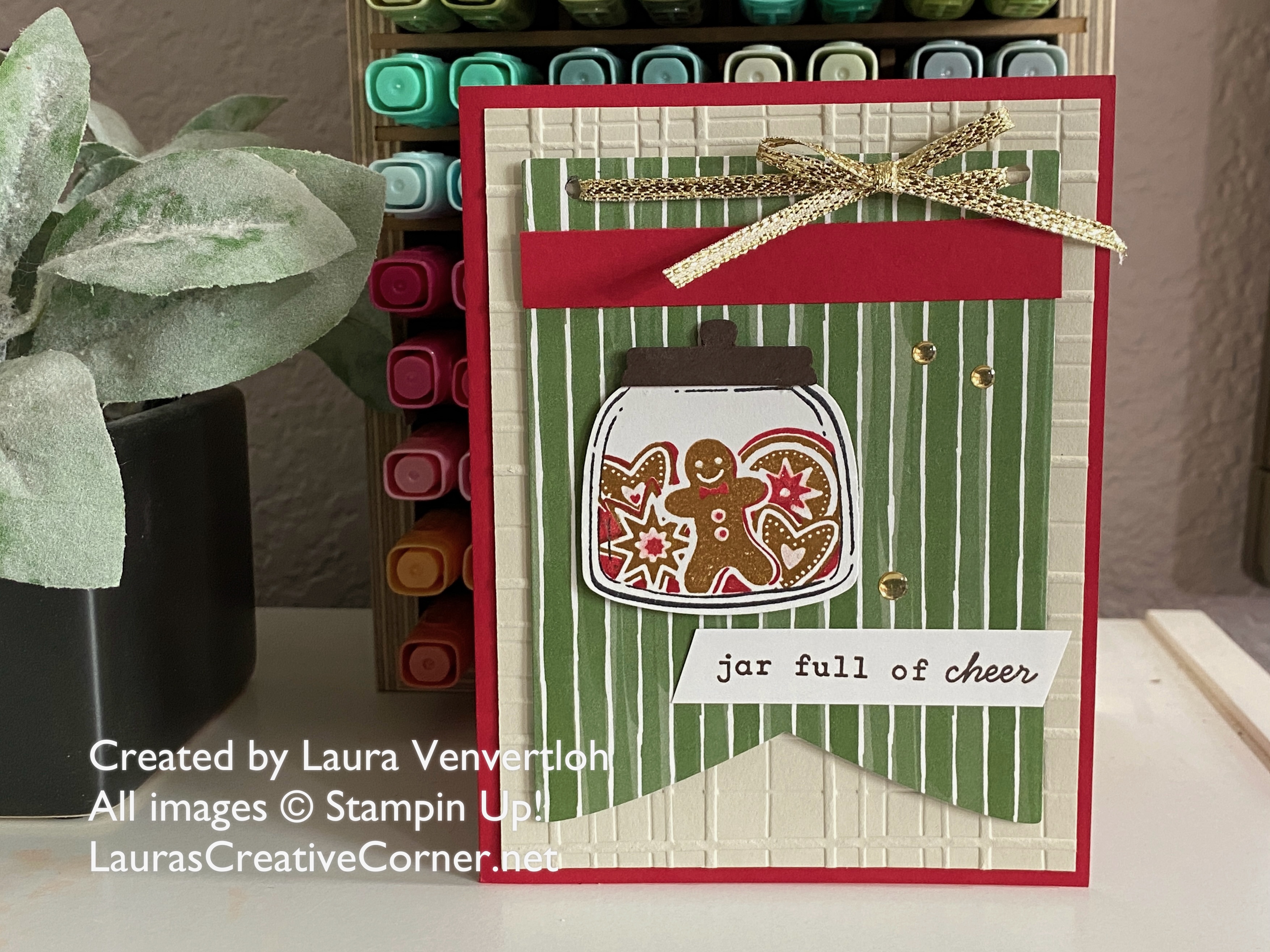 This warm and cozy design showcases a jar filled with gingerbread cookies, peppermints, and festive colors. I paired the jar with green striped paper from the Nests of Winter DSP, a banner cut out from the Party Banners dies set, and a touch of gold ribbon for that extra holiday sparkle. This card smells like Christmas just looking at it!