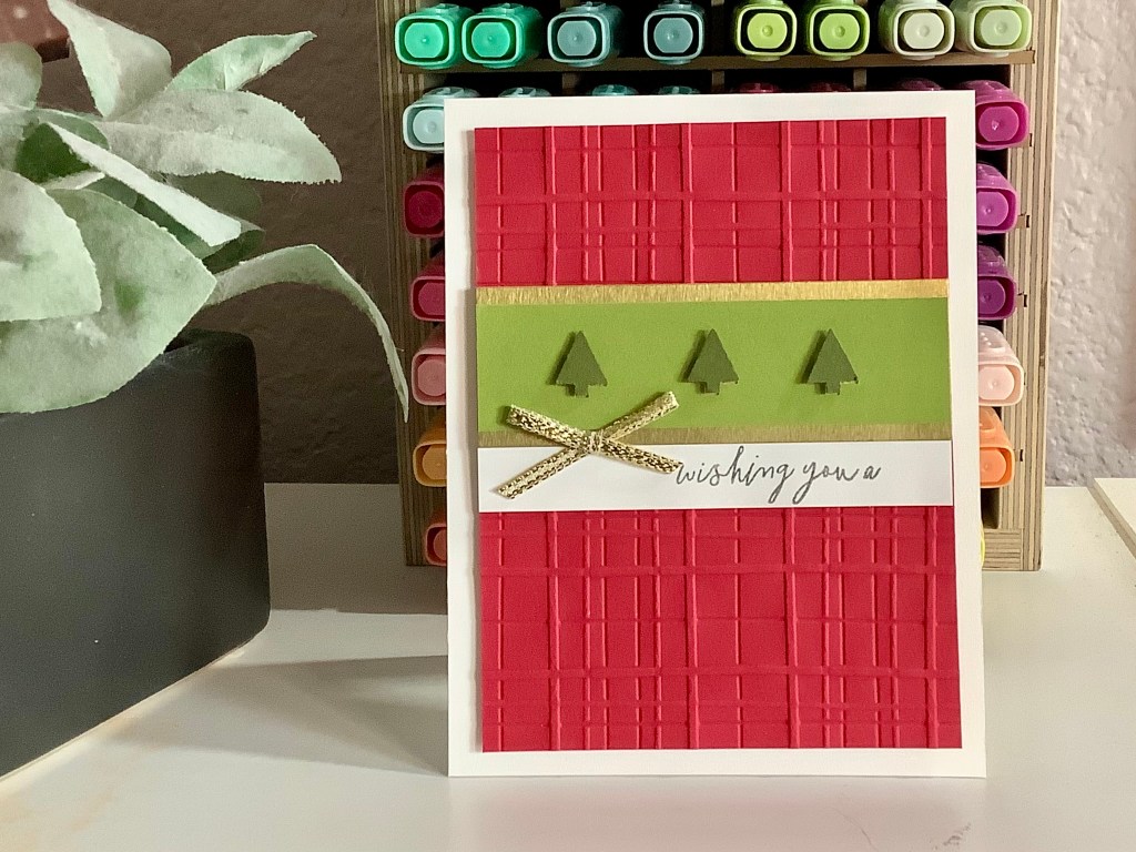 Simple elegance meets texture in this clean and modern design. The card base features an embossed Real Red using the Forever Plaid 3D embossing folder. A simple row of punched trees takes center stage on a band of Old Olive.