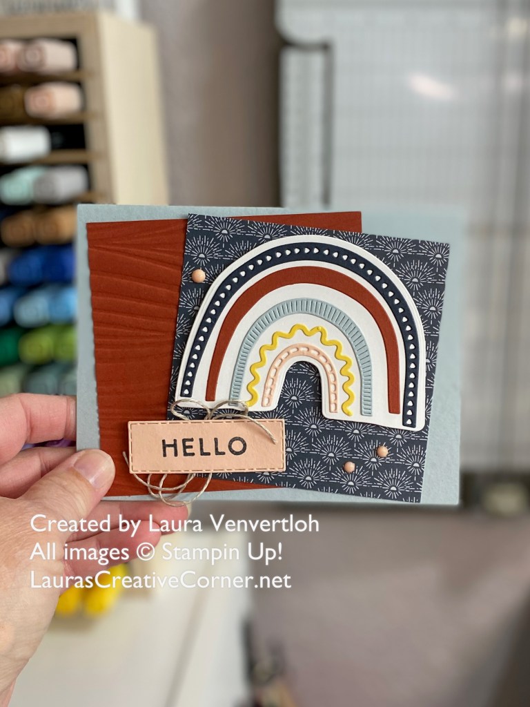 For this card, I cut layered rainbow arches using dies from the suite and paired them with a starburst-patterned background for contrast. The Soft Waves 3D folder creates the perfect textured panel of Cajun Craze cardstock adds warmth, while the little “Hello” sentiment finishes it off with a sweet touch. I also added Muted Pallatte Dots and a bit of twine to give the design more depth and personality.