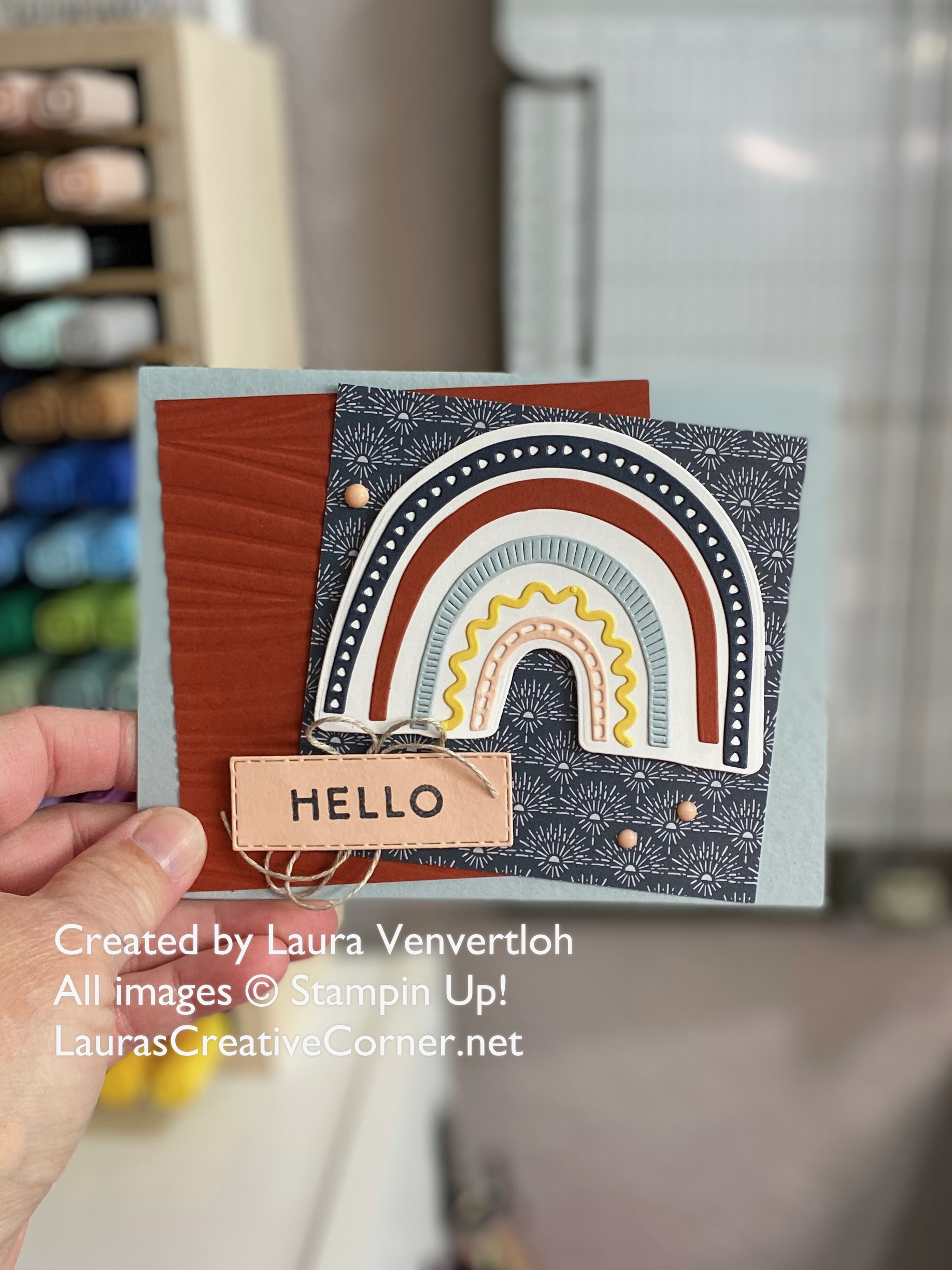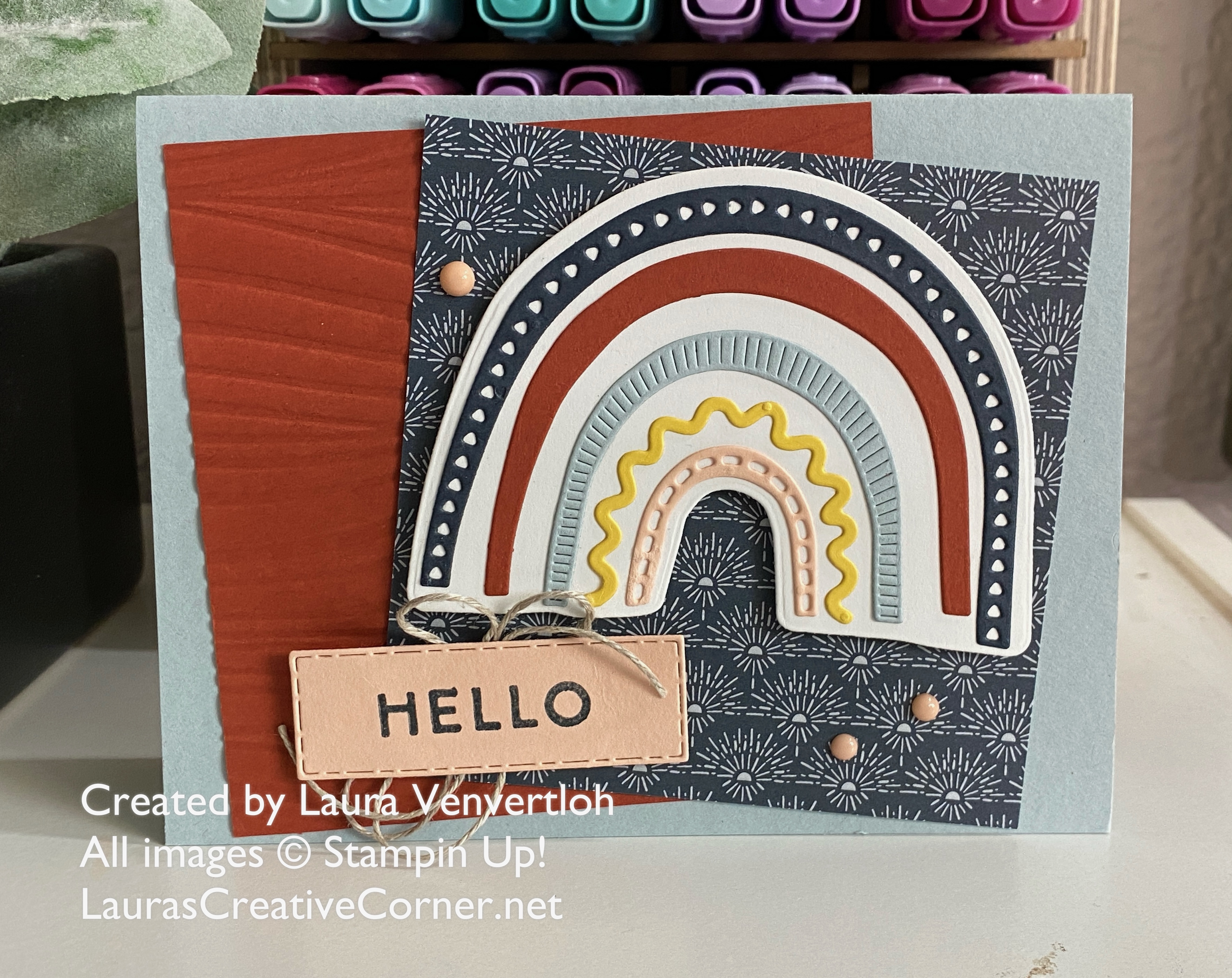 For this card, I cut layered rainbow arches using dies from the suite and paired them with a starburst-patterned background for contrast. The Soft Waves 3D folder creates the perfect textured panel of Cajun Craze cardstock adds warmth, while the little “Hello” sentiment finishes it off with a sweet touch. I also added Muted Pallatte Dots and a bit of twine to give the design more depth and personality.